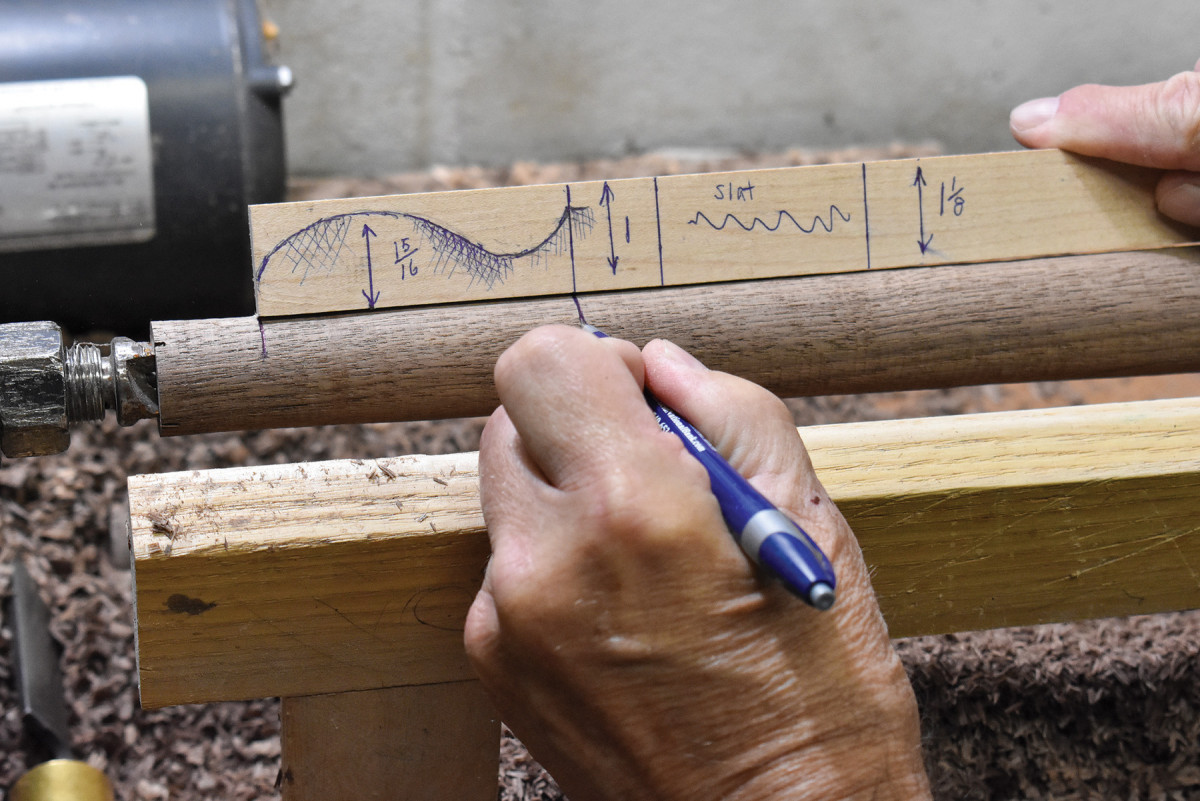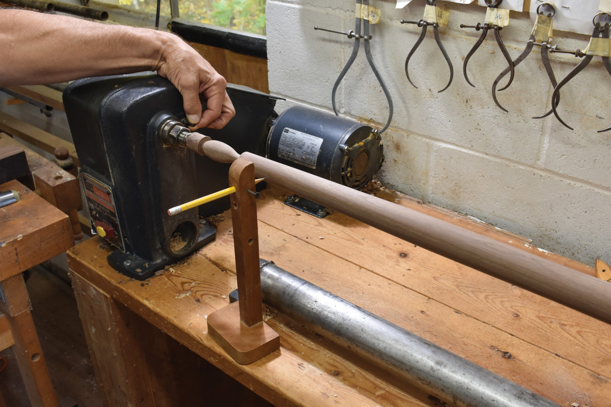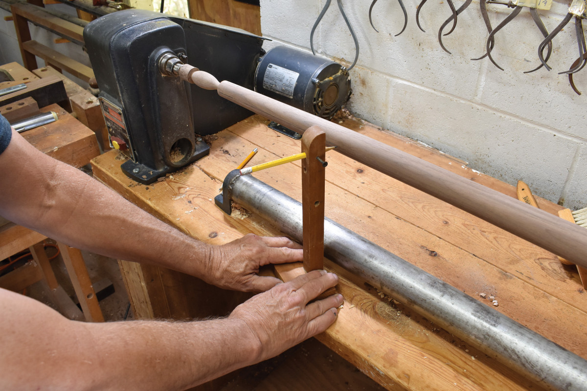 5. To draw the lines along the lengths of the posts’ outside diameters, I use this simple jig which does nothing more than hold a pencil point at a height equal to the distance between the bench top and the lathe’s axis of rotation.