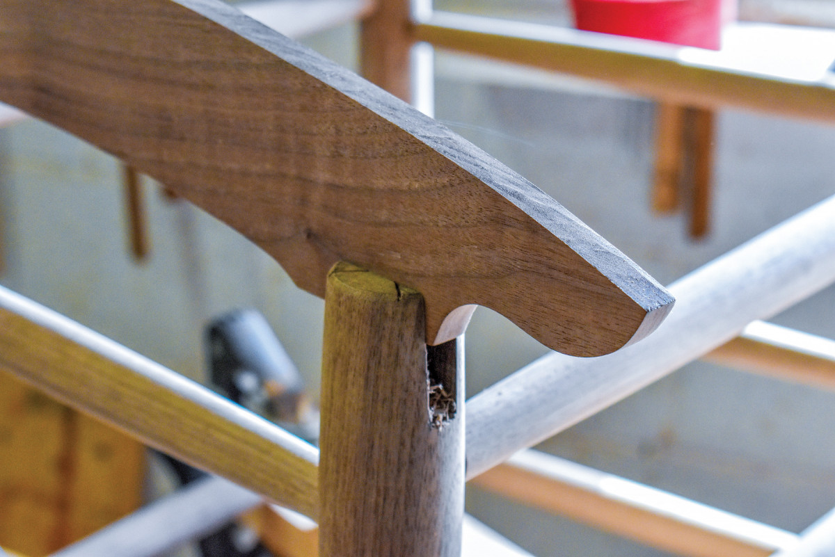 During a half century in the shop, I’ve taught myself to use steam to inflate bumps on furniture parts, that even deep gashes in the wood can be removed with some clever work with a hand plane or a rasp and sandpaper, how to lengthen mitered parts with a hand plane (yes, it can be done), to use clamps to seat a set of dovetails so there are no gaps around the pins and tails. But most important I learned that sometimes a part or even an entire piece must be destroyed because a mistake has forced me into a corner where there are no good solutions. That’s a tough lesson, but one essential for anyone who wishes to ensure that only good work leaves his/her shop. But in the case of this chair, there were deadlines I had to meet: a customer awaiting delivery on the chair and a magazine awaiting delivery on a story about the making of the chair. This took away the nuclear option and forced me to focus on how this chair might be saved, rather than on how it might be replaced.