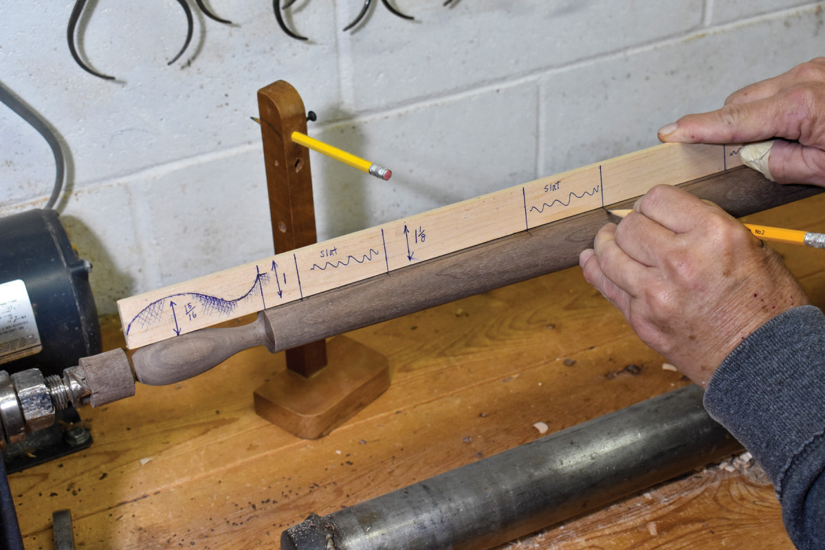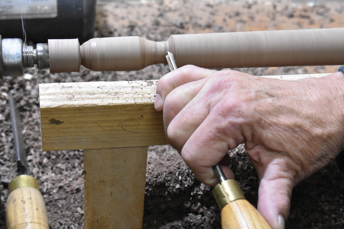 2. Once the entire length of the back post has been tapered, I use my story stick to transfer locations for turned features.