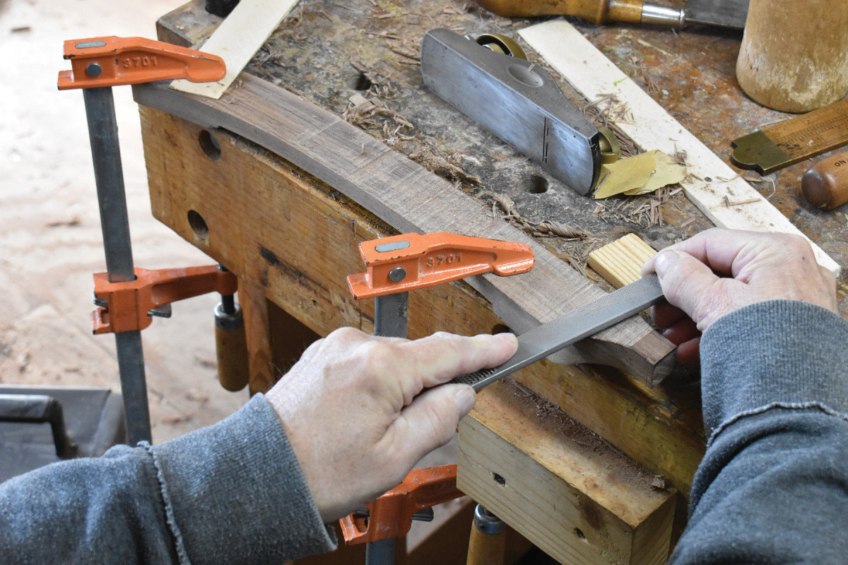 32-33. A block plane can be used across the grain as well as with the grain. Here, I’m planing the bottom middle section of the arm.