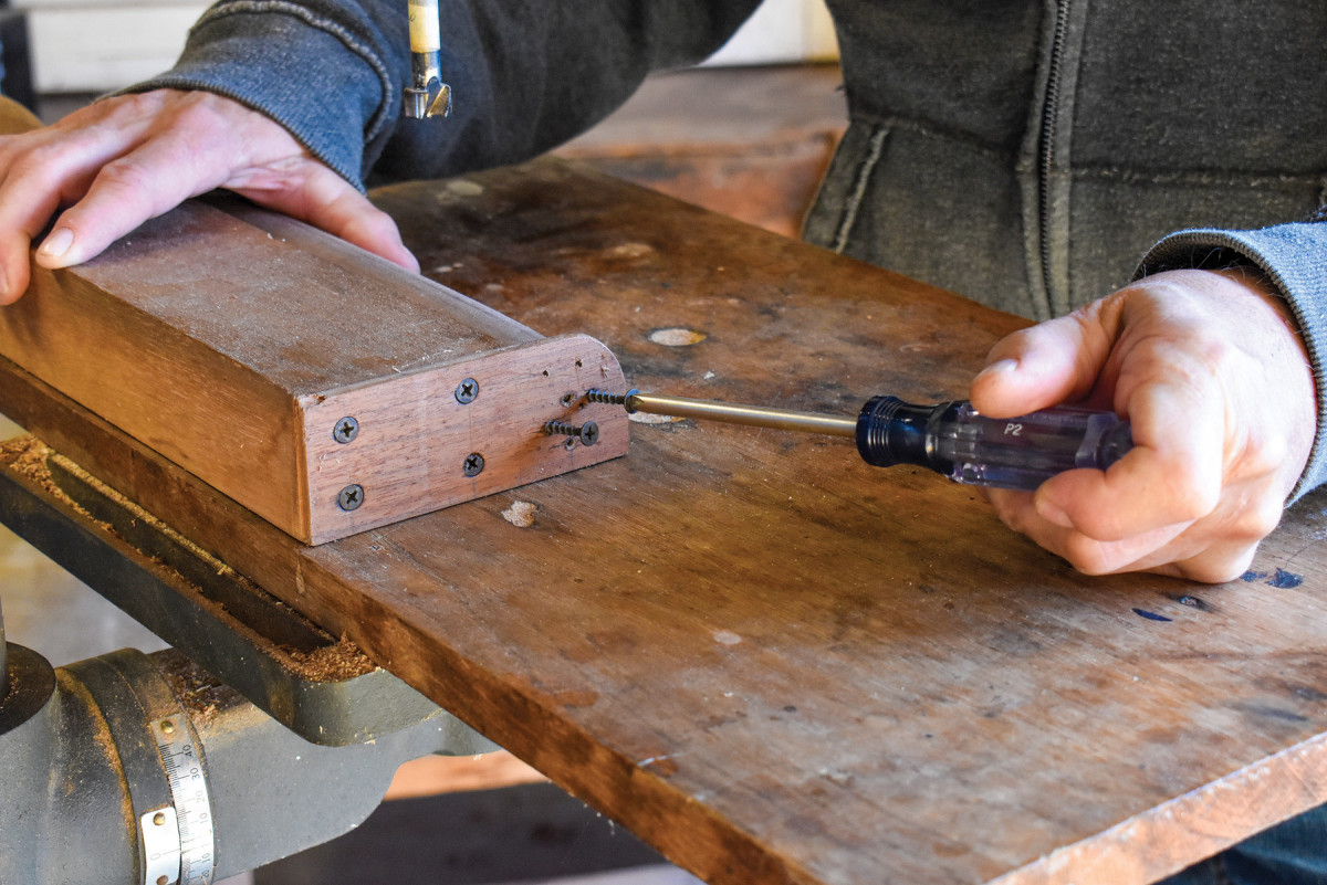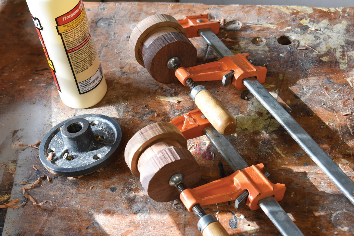 34. The mushroom caps atop the front posts have a contour that reaches all the way to their undersides. That means a two-part turning caul is necessary. The first, the larger caul is drilled to receive the screws that attach the face plate. The second, the smaller caul, is glued to the first and is then glued to the mushroom-cap blank. In both cases, the glue joints are constructed with a bit of newspaper between the wood components. I clamp them as shown, then leave them overnight.