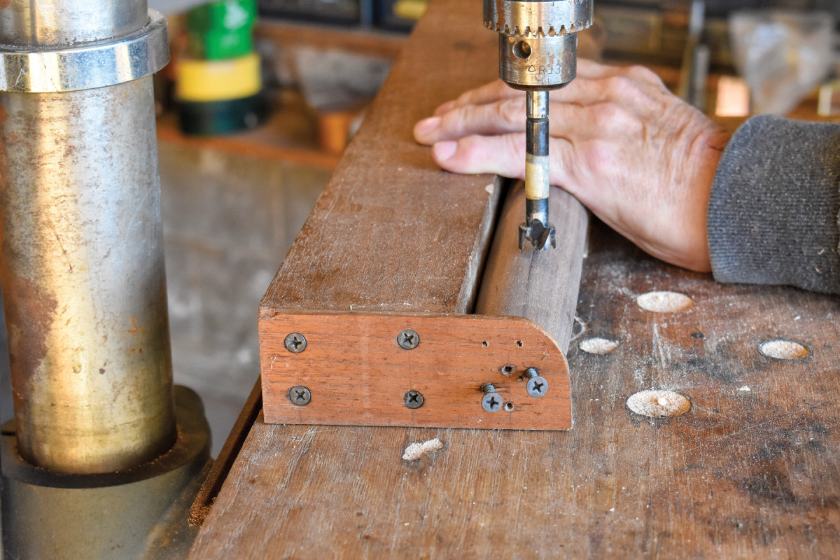 8. With the front post’s rotation locked in, I bring the Forstner bit down into the work. With straight-sided posts, it’s possible to work to a fence, but with tapered posts like these, you have to eyeball each one.