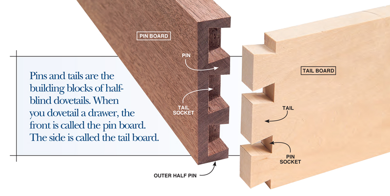 The handmade half-blind dovetail joint is an enduring symbol of fine craftsmanship. Every proud woodworker who has conquered the dovetail wants to show it off. In the old days, when every piece of wood was worked by hand, mastering this joint took lots of practice. But not today. Using machined parts and my new method, you can make perfect half-blind joints the very first time you try. There’s no fussy trial-and-error fitting.