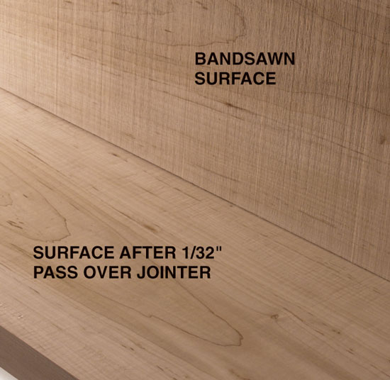 Photo 2: We resawed 1/8-in. veneer from 8/4 slabs of maple to test the blades. The sawn surface of the slab was then passed over a jointer set for a 1/32-in.-deep cut. If a single pass cleaned up all the saw marks, the blade made it onto our chart below.