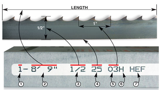 Photo 3: The features we liked for resaw bandsaw blades are listed right on the box. 1. Quantity of blades. 2. Blade length. 3. Blade width. 4. Blade thickness in thousandths of an inch. 5. Number of teeth per inch (tpi). 6. Tooth form (H = hook tooth). 7. Blade type (HEF = hard-edge flex-back).