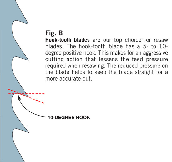 Tooth form describes the shape of the tooth. A hook tooth is the best tooth form for resawing. The hook angle cuts aggressively and has a self-feeding action that reduces feed pressure (Fig. B, below). Durability