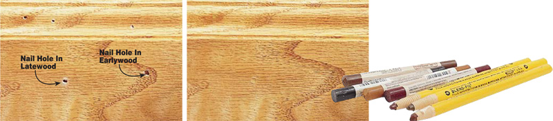 These fillers are crayon-like in texture and come in a variety of shades to match most finishes. These fillers are easy to apply. Simply rub the stick over the hole until it’s full, then wipe off the excess with a clean rag. If you goof and the color is off, just take a wire nail, gently dig out the filler and try a different shade. You can also blend colors. For example; if the color from a stick is a little light, score the surface of the filler and rub in a darker color. The two colors will blend in the hole and produce a new shade.