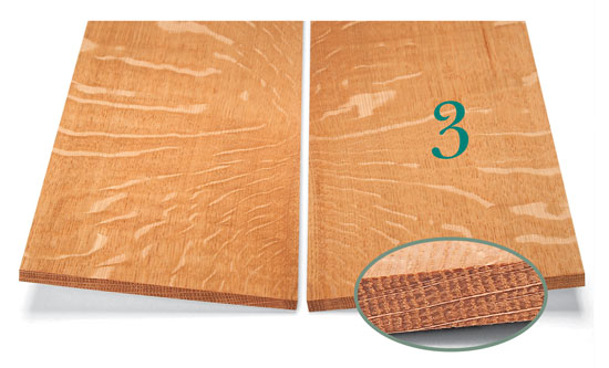 Quartersawn boards are rarely wide enough for a large panel, so in many cases you must glue boards together or resaw and book-match a single board. Here’s a rule of thumb for resawing quartersawn oak: Look at the outside faces before you cut. If both sides have strong flake figure, the inside faces will have dramatic figure, too. If one outside face has weak figure, the inside faces probably won’t be great. The best board to pick for resawing will have perpendicular growth rings (see inset photo). |