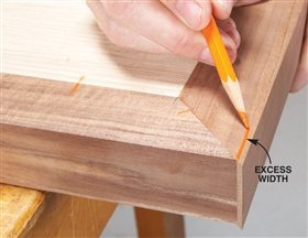11. Draw a line on the short piece indicating its excess width. Joint the piece's outside edge to make the piece narrower. Cut biscuit slots and glue it to the top.