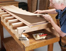 6. Assemble a shop-made veneer press and go through a dry run. The lower half of the press consists of a series of stout cross-bearers supported by two boards that run the length of the bench.