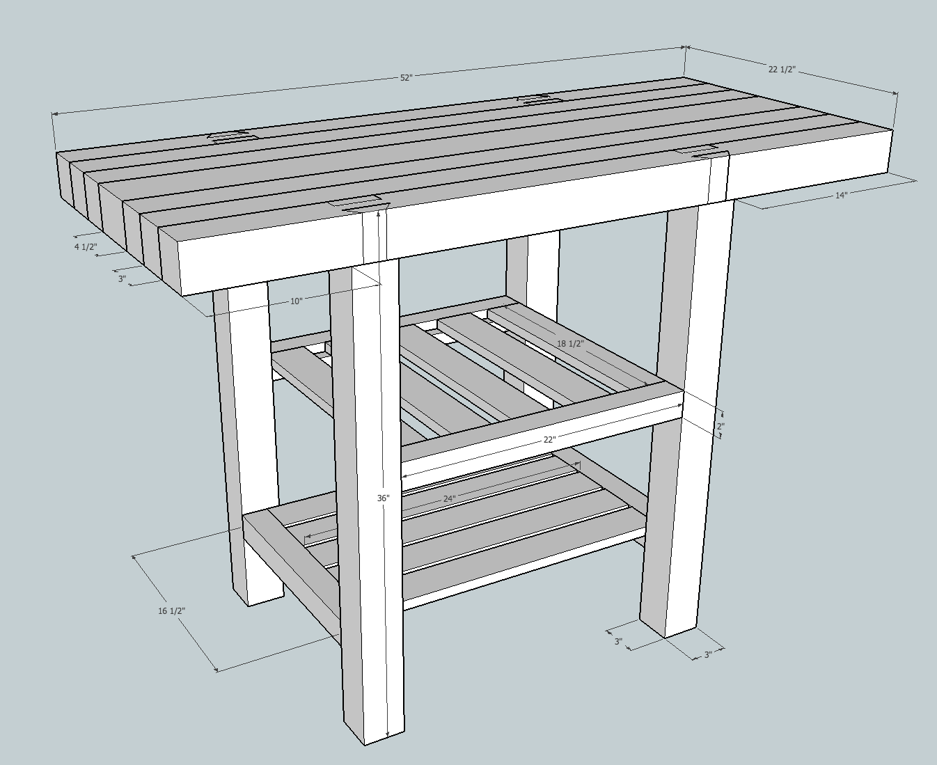 So…it turns out, my final (I think) kitchen island design looks one heckuva lot like my little Roubo bench, with it’s through-tenon and sliding-dovetail leg-to-top joints, thick top, and sturdy legs and stretchers (the legs and stretchers will likely get deep chamfers, with perhaps a lamb’s tongue treatment at either end…but I didn’t draw that in here – it’s Sunday).
