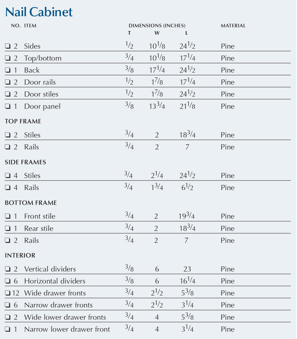Nail Cabinet Cut List and Exploded View