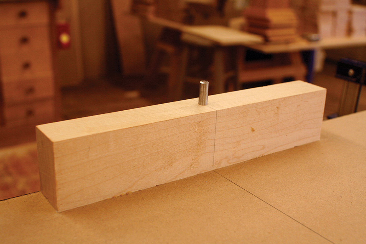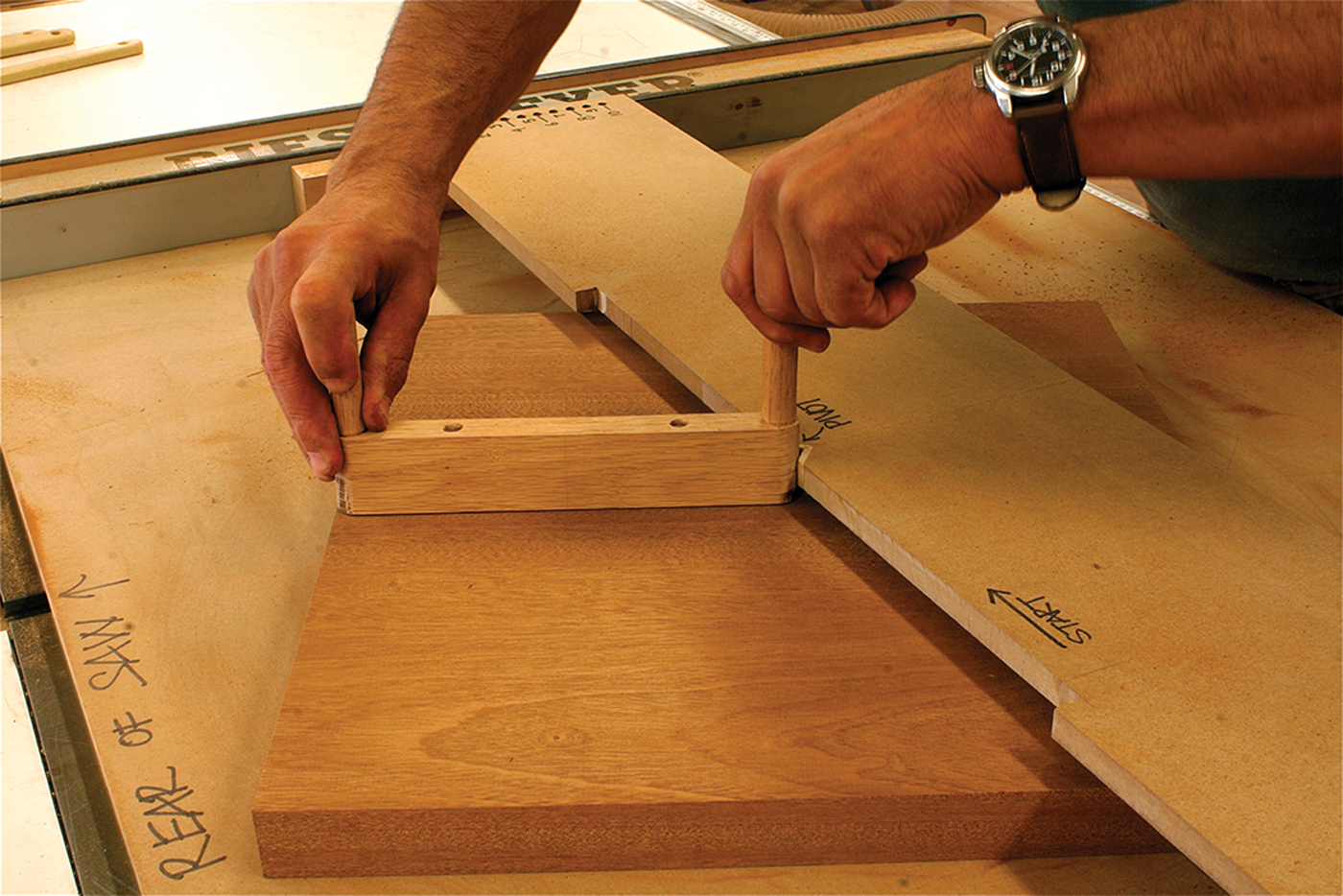 At each end of the block are dowels used for handles. These handles need to extend at least 1-1⁄2” above the block – long enough to provide a secure grip for the operator while guiding the seat blank along the bridge’s travel groove. The guide block is mounted perpendicular to and flush with the front edge of the seat blank, and it’s centered side to side.