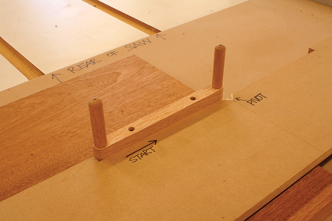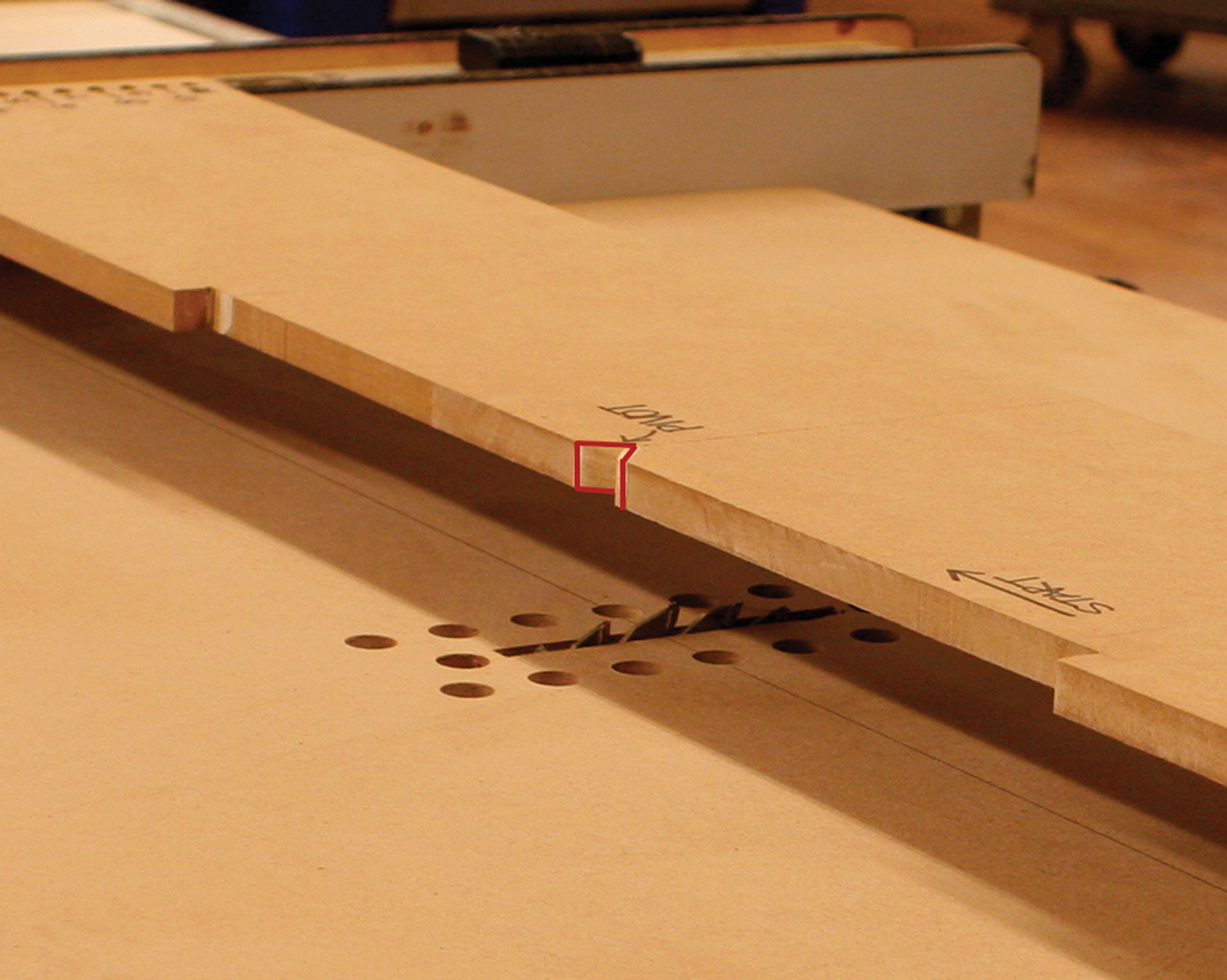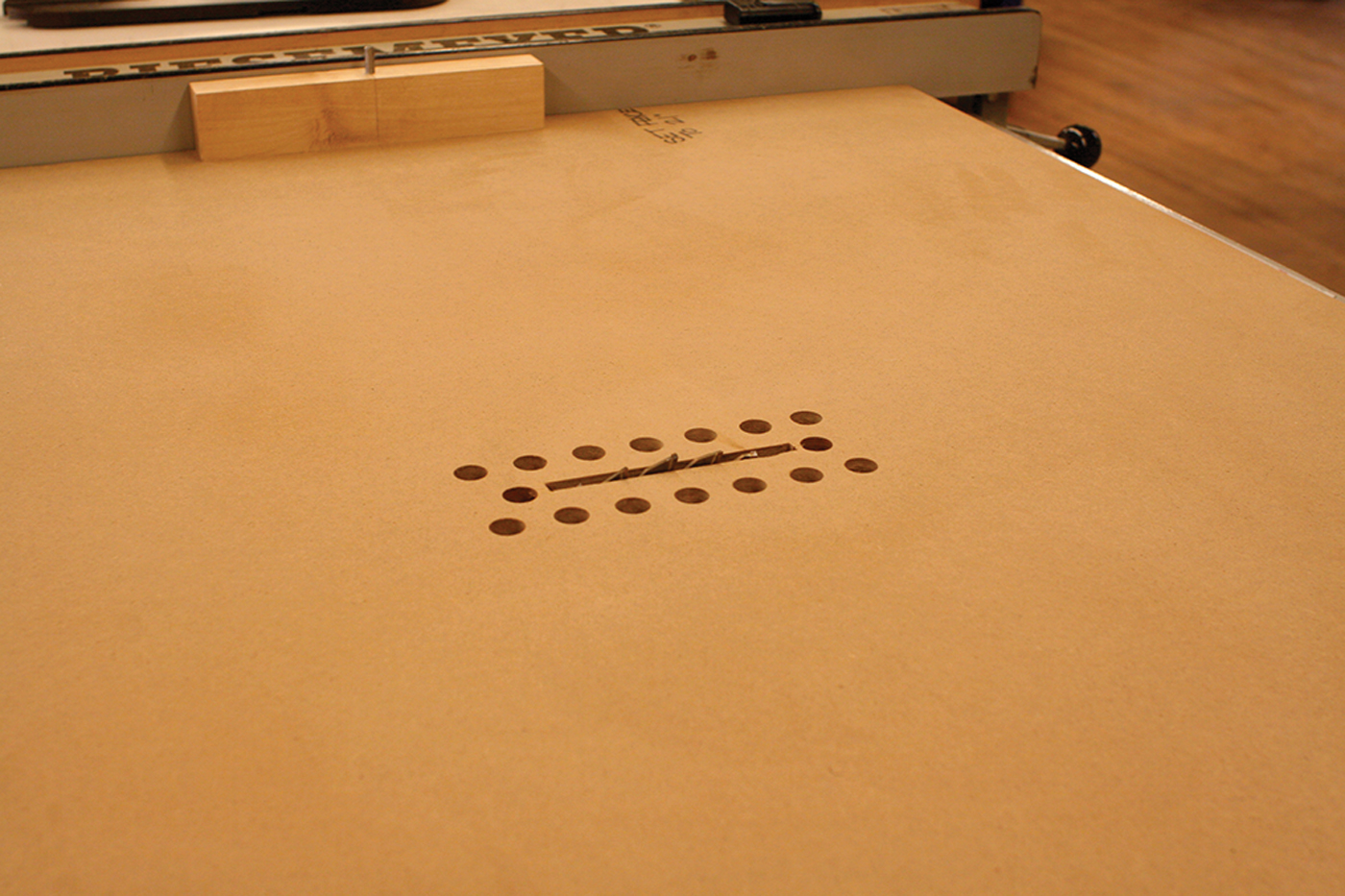 With the blade all the way down, secure the MDF to the saw. Start the saw and slowly raise the blade through the base about 3⁄8” above the MDF. Remove the base and drill a series of 1⁄2“-diameter holes around the saw cut to facilitate sawdust collection. Based on the location of the saw cut, draw a line perpendicular to the apex of the saw blade’s height.