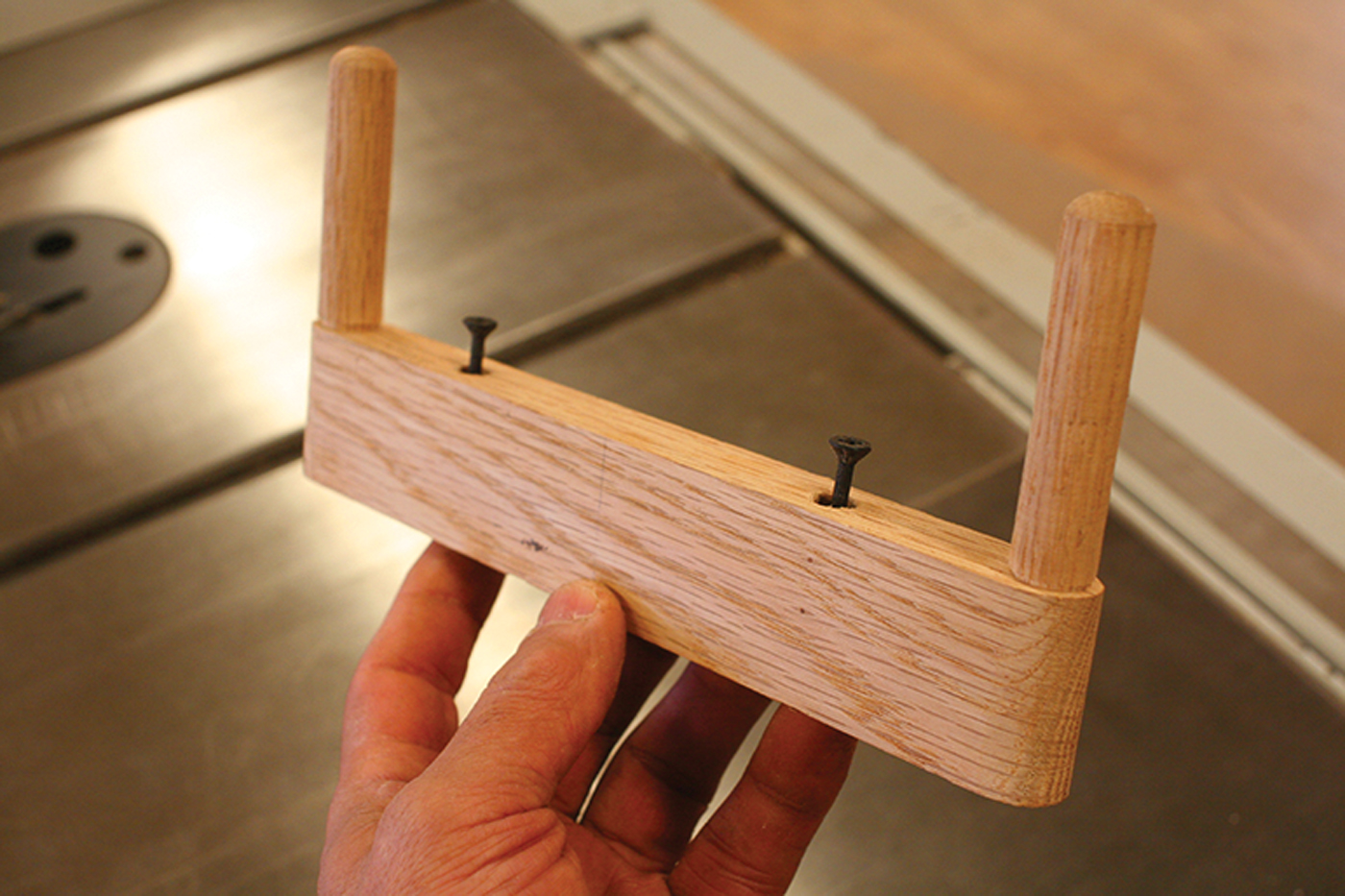 Get a handle. The guide block attaches to the bottom of the seat and controls the blank’s travel along the bridge. Dowels serve as handles.