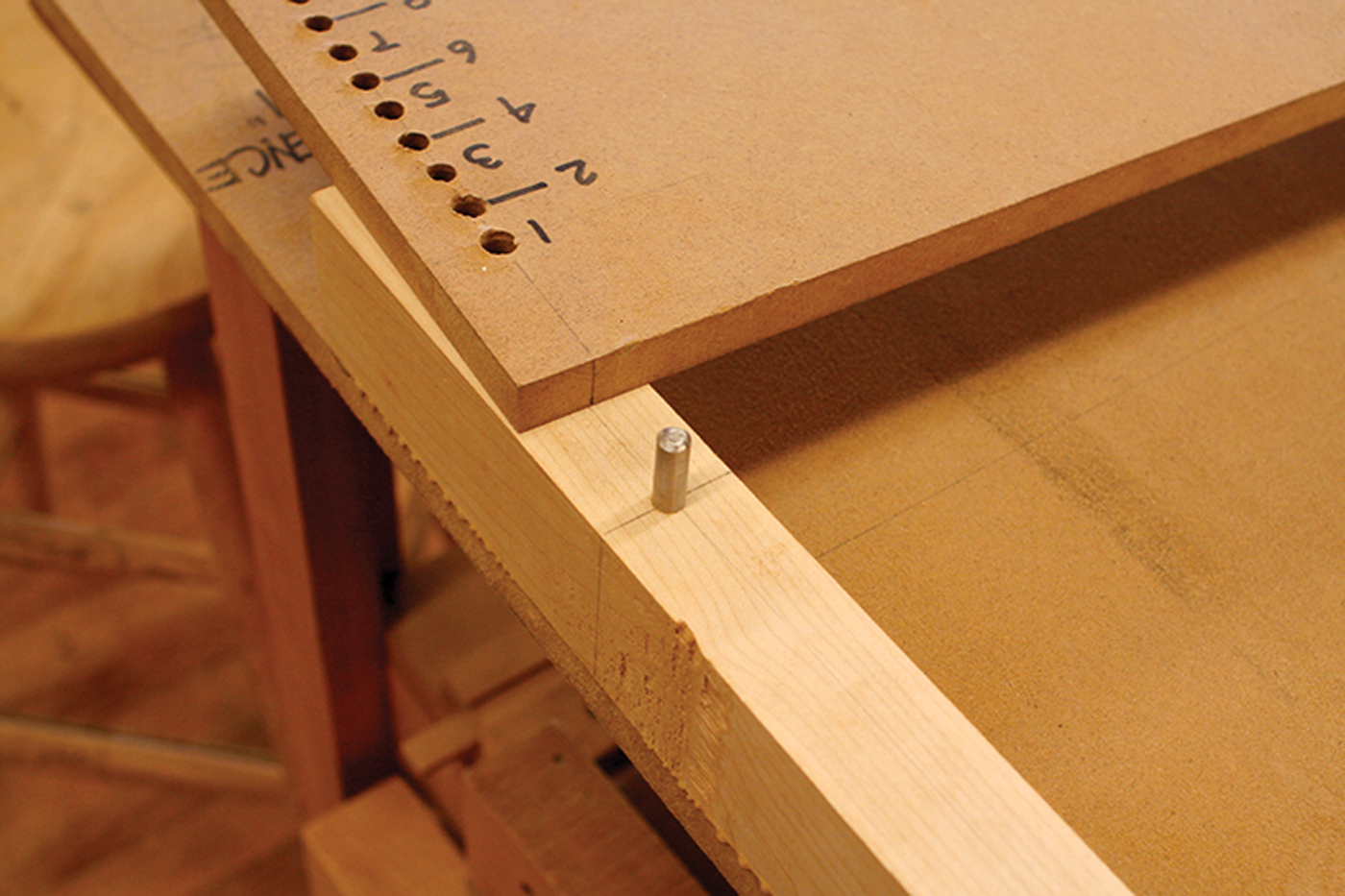Bridge indexing. Both ends of the bridge have 1⁄4″ holes set on 1⁄2″ centers that are used to position the bridge on the support pins.