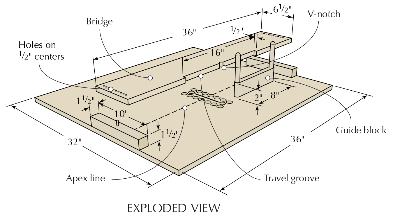 The bridge is a critical part of the jig. It controls the width and length of the scoop (the depth is controlled by the height of the saw blade). The bridge extends across the table saw and is approximately 6-1⁄2” wide and as long as the width of your jig’s base. Centered along its length is a 1⁄2“- deep x 16”-long cutout that I call the “travel groove.” Centered on the travel groove is a 3⁄8“-wide V-notch. At each end of the bridge is a series of ten 1⁄4“-diameter holes, spaced 1⁄2” from center to center. These holes must be spaced side to side so that the bridge will drop onto the 1⁄4” pins in the bridge support blocks.