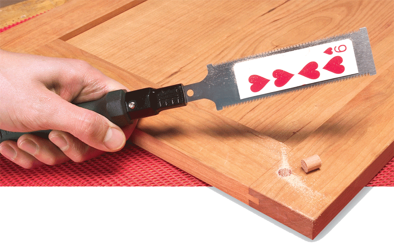 card limits the saw’s depth of cut, so I saw the dowel halfway, then finish from the opposite side.