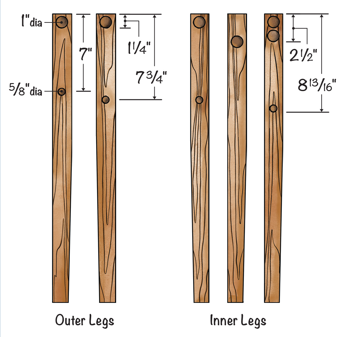 Looking at my dry fit, I decided to make things just a bit more complex and test my own thought and skills. The addition of the inside, lower stretchers was a last-minute decision. This is why I like to do dry assemblies — it’s the last opportunity for design changes. A 5/8“ mortise was drilled into each one. I used the same V-block that held the parts in the router table, and drilled the mortises. A few more stretchers and tenons (made like before) completed the look I was after.