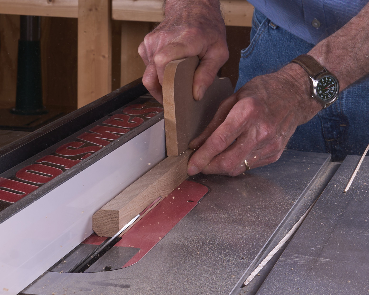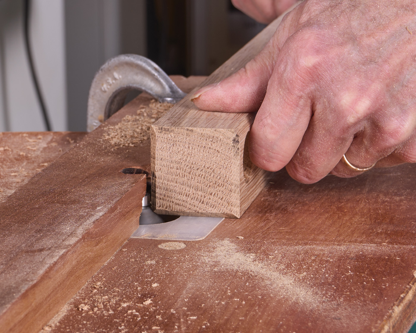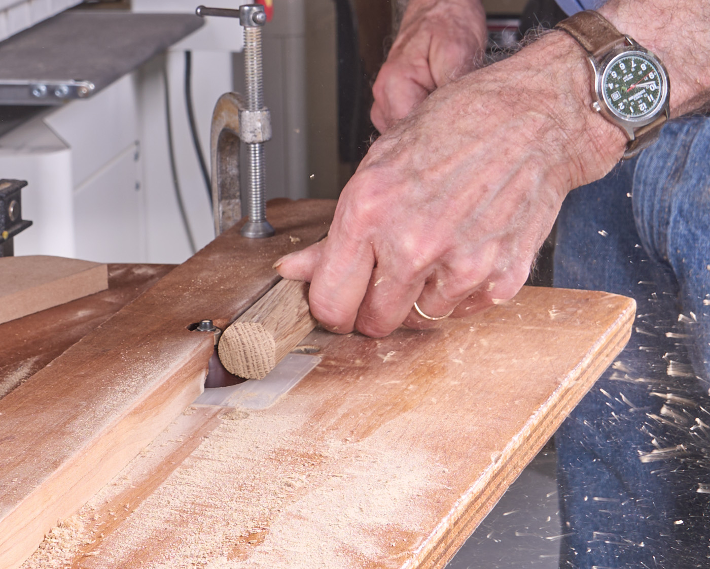 I used an interesting router table technique in this project to mill the lower stretchers. It involves a V-shaped block so that you can place the part within it, and turn it over a running bowl and tray bit. Doing it this way allows you to form a tenon on the end of each stretcher without needing to touch a lathe (though, if you have a lathe, you can certainly turn them as well).