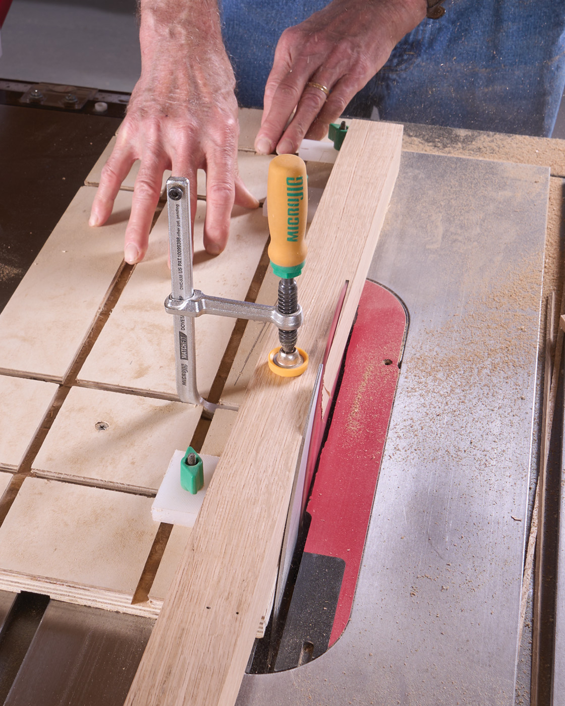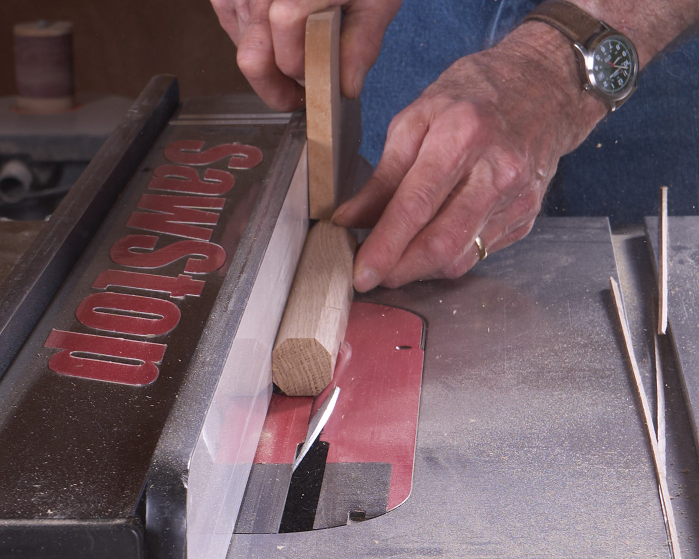 To convert the 5/4 into 1“ diameter dowels, I first ripped to 5/4 square stock and then planed it to 1“ thick squares. To ease the work on the router table, cut the stock into octagonal shape on the table saw. Simply tilt the blade to 45° and rip off each corner. Removing some of the material first will make routing with a large 1/2“ radius roundover bit far easier. Setting up the exact height of the router bit and the correct position of the router fence is essential to get a round dowel. Don’t forget a push stick here as well. A total number of 22 parts are required for this bench though fewer would be required for a simpler design. In order to be as accurate as possible, I leave about 4“ of extra length is on each part. This allows us to cut them to the exact dimensions as we need them.
