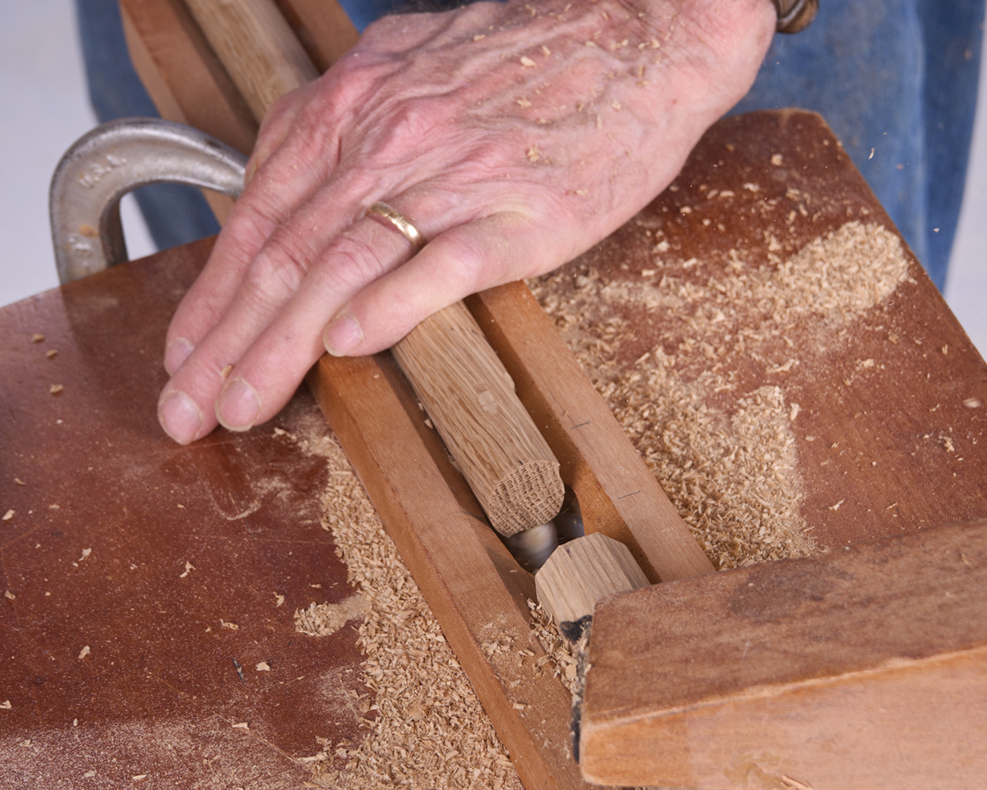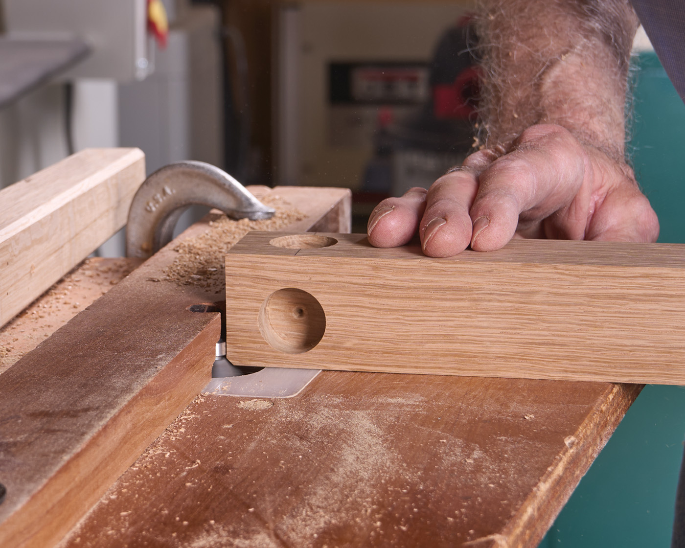 A bit of practice may be required to get the technique right. Remember, to get an accurate fit, raise the bit in small increments, stopping when you get a fit that’s close to the 5/8“ final dimensions. Since the router will remove material in each dimension, only a very slight change of depth can have significant effect. If given my choice, I choose to leave the tenons slightly large — a bit of hand sanding, or work with a rasp is easy enough to do the final sizing. It should be remembered that since you’ve made the dowels yourself, they can vary from one part to the next or even from end to end, so test fit each part as you go, making sure to match each tenon with its corresponding mortise.