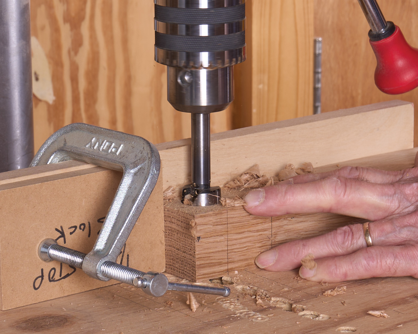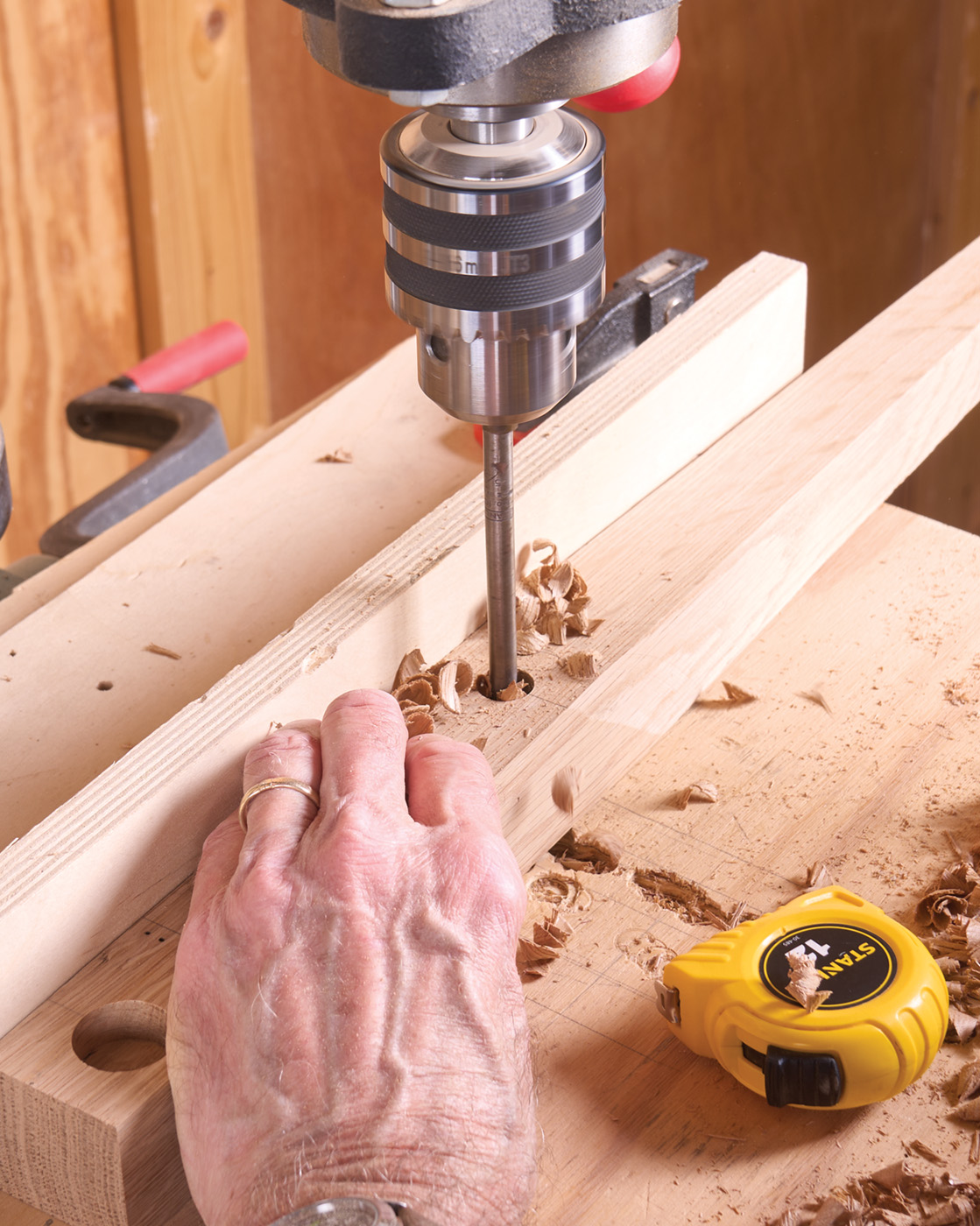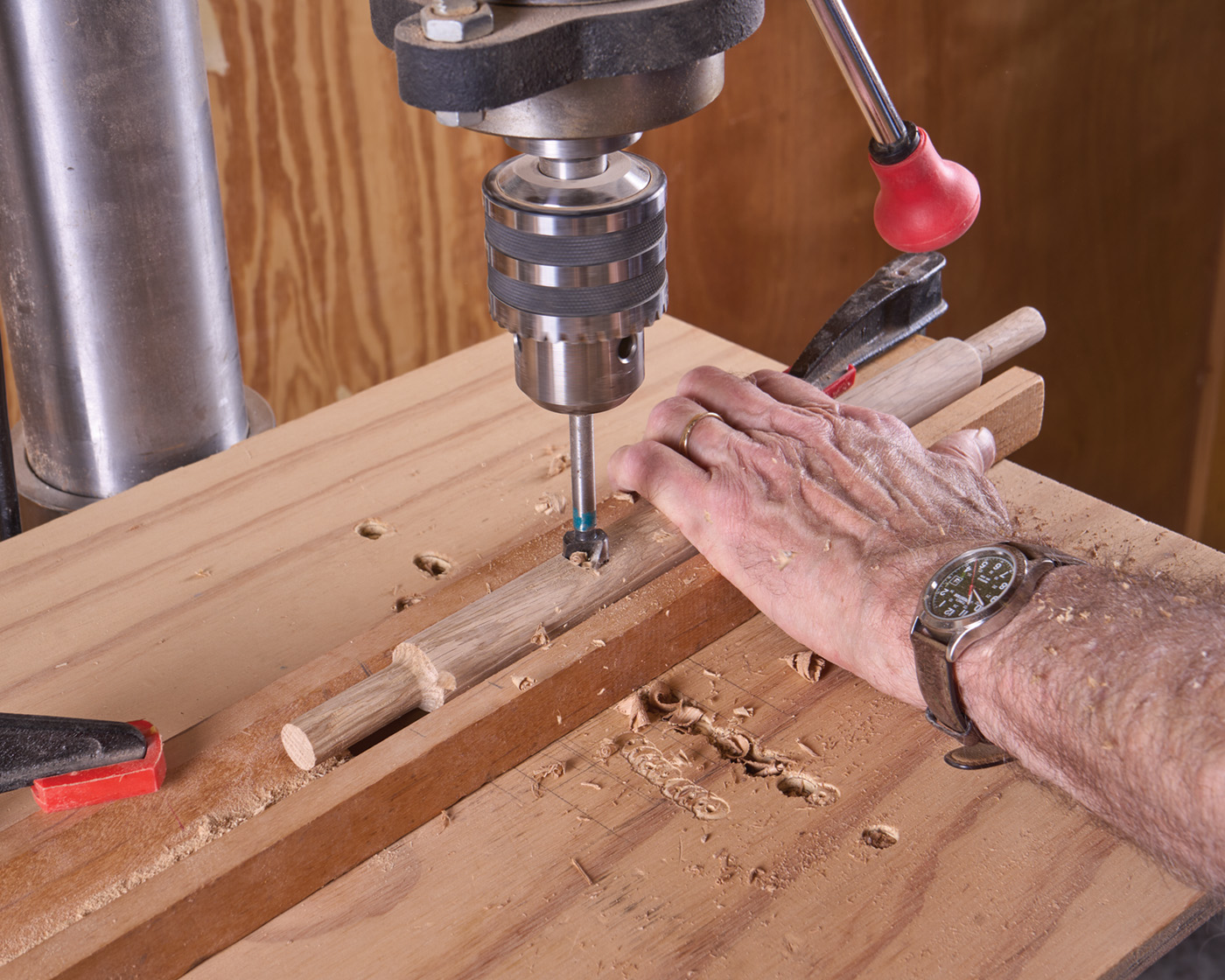 Looking at my dry fit, I decided to make things just a bit more complex and test my own thought and skills. The addition of the inside, lower stretchers was a last-minute decision. This is why I like to do dry assemblies — it’s the last opportunity for design changes. A 5/8“ mortise was drilled into each one. I used the same V-block that held the parts in the router table, and drilled the mortises. A few more stretchers and tenons (made like before) completed the look I was after.