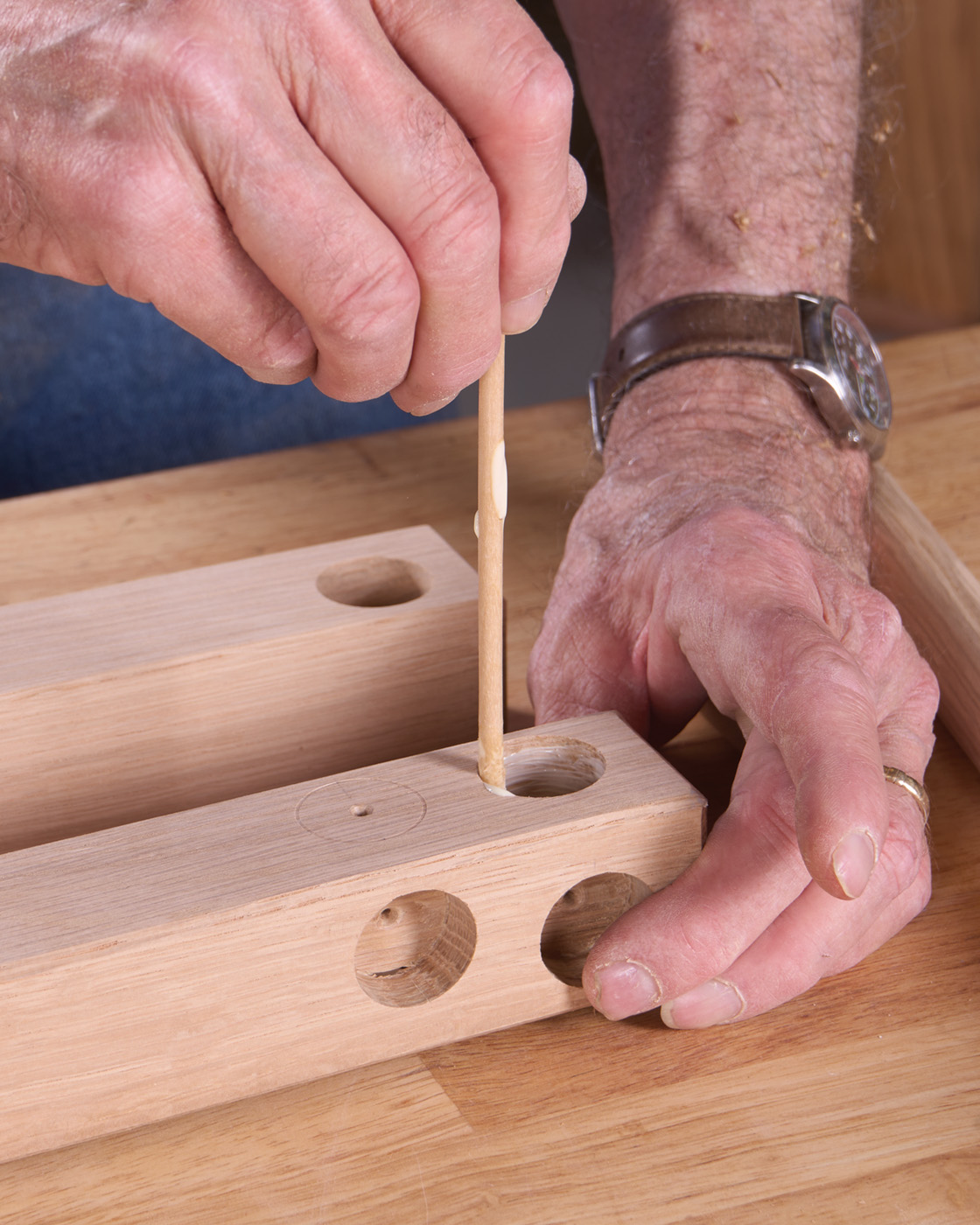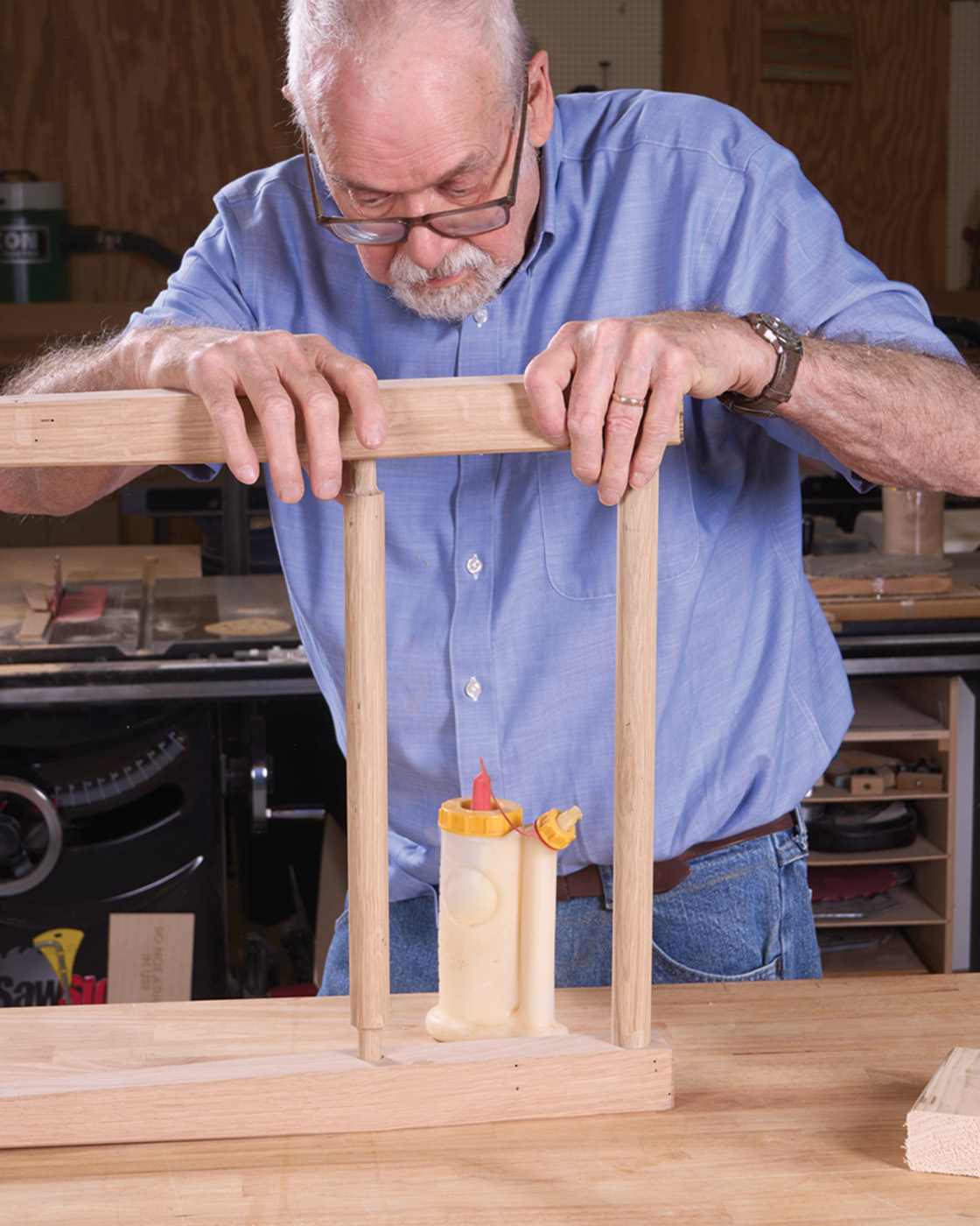 17 Repeating the same process, apply glue into the mortises and insert the stretchers.