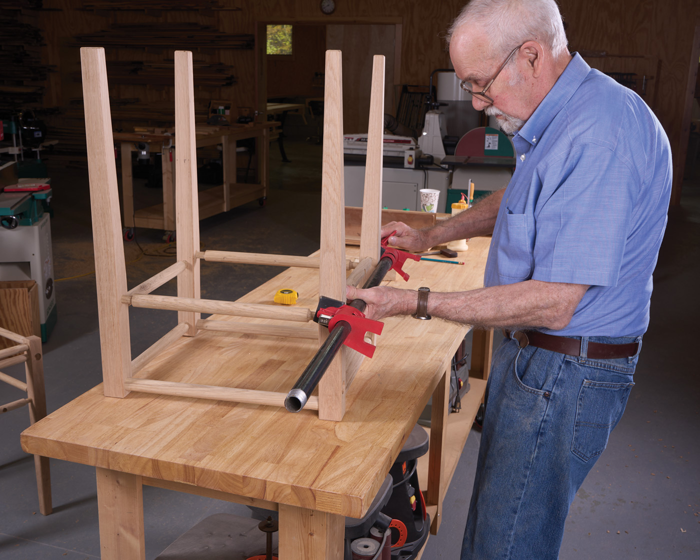Now, you can start fitting the connecting stretchers. Once everything is assembled, apply clamps where you believe they are necessary. A few pipe clamps on critical joints is really all that is needed. Once the glue dries, you can apply finish. I applied a Danish oil finish to this one. After waiting overnight, the Shaker tape could be woven in place.