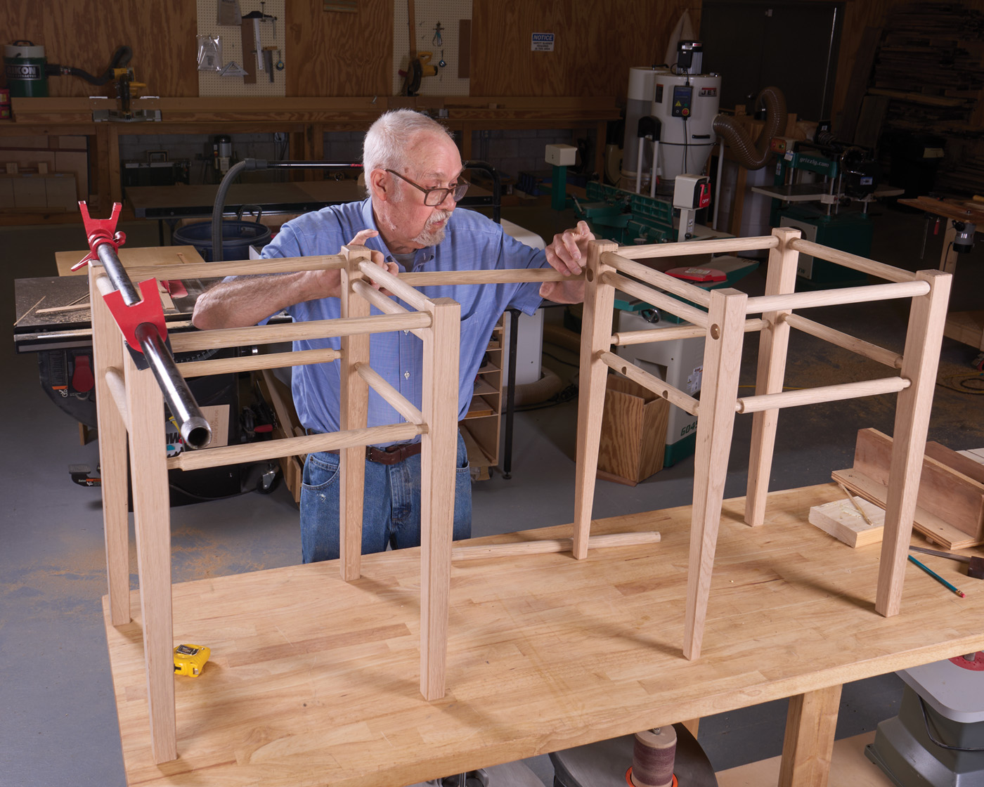 With that done, the bench was ready (after sanding) for assembly. I started by assembling the ends first. Check everything for square, but the round tenons are pretty self-squaring (as long as your lengths are accurate). Once I have two end assemblies together, it’s time to connect them. Place the assemblies on a flat surface—this ensures that they do not twist in relation to each other.