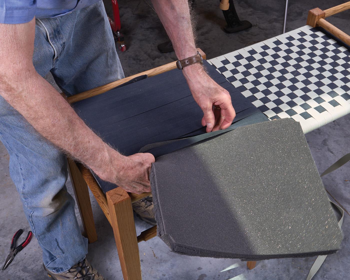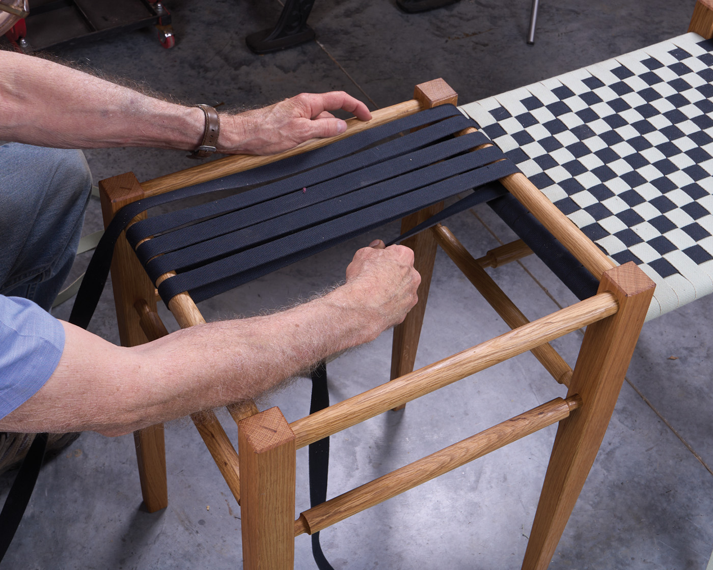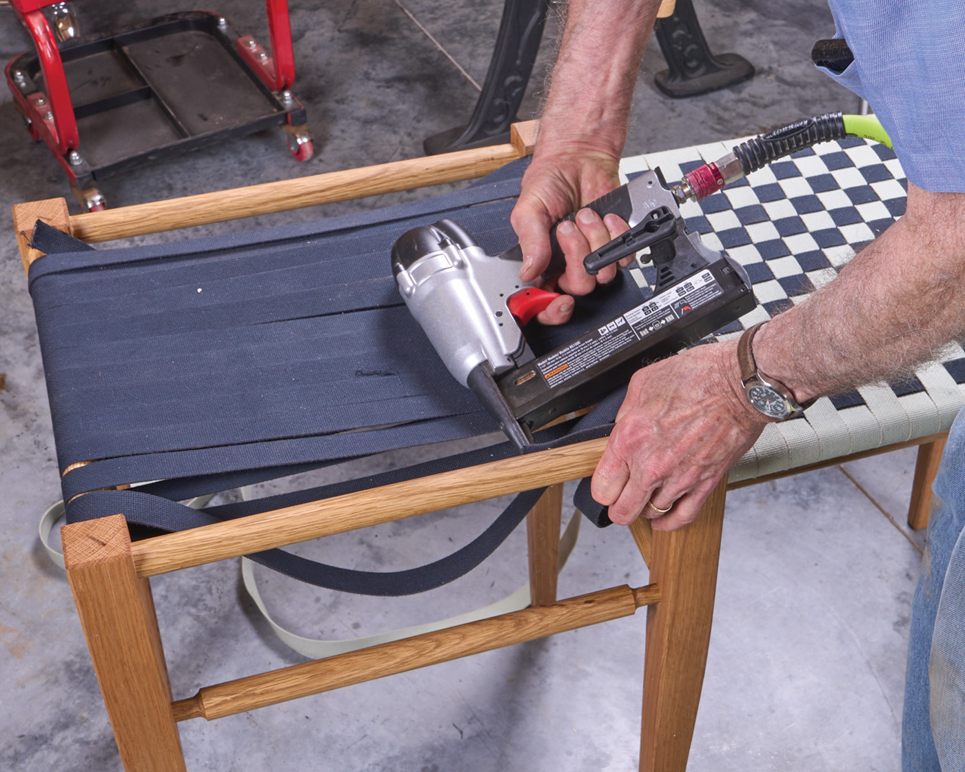 Before proceeding to add the contrasting color, I place a thick piece of black foam in between the shaker tape for added comfort. I then weaved the contrasting color throughout. This pattern is a simple over, under, over pattern. You can weave the bottom as well, if you’d like, or just leave it flat. As you get towards the end, scrunch all of the tape together for a tight look — you may be surprised that you can fit another row or two when you thought you were done. After that was complete, I used the narrow crown staple once again to secure the ends. Now, work on the next two seats before placing this bench on display in your house.