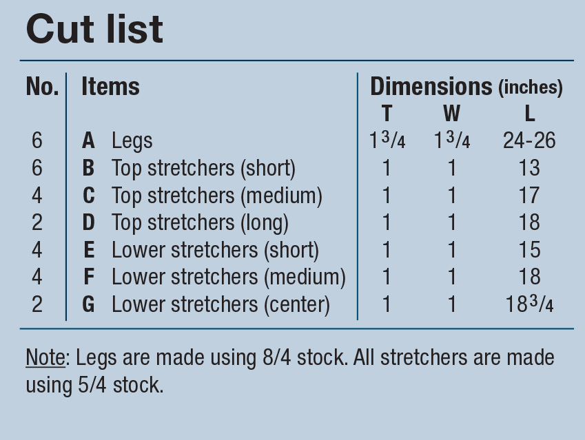 Measure the front rail between the legs and depth of the project. Multiply together. If using 1“ tape, divide the resulting number by 9 and if using 5/8“ tape, divide by 5.3.