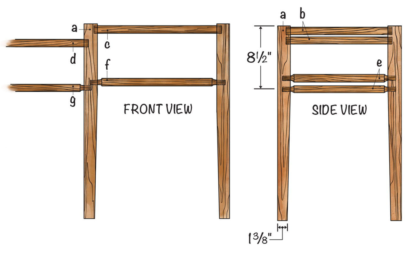 I utilized air-dried white oak for this project, in 8/4 (2“ or 50.8mm) and 5/4 (1-1/4“ or 31.75mm) dimensions. The 8/4 wood will be used for the legs and the 5/4 for the stretchers between the legs. You can use common dowels for some of the parts, but I chose to avoid the expense and make my own dowels from white oak to provide greater strength.