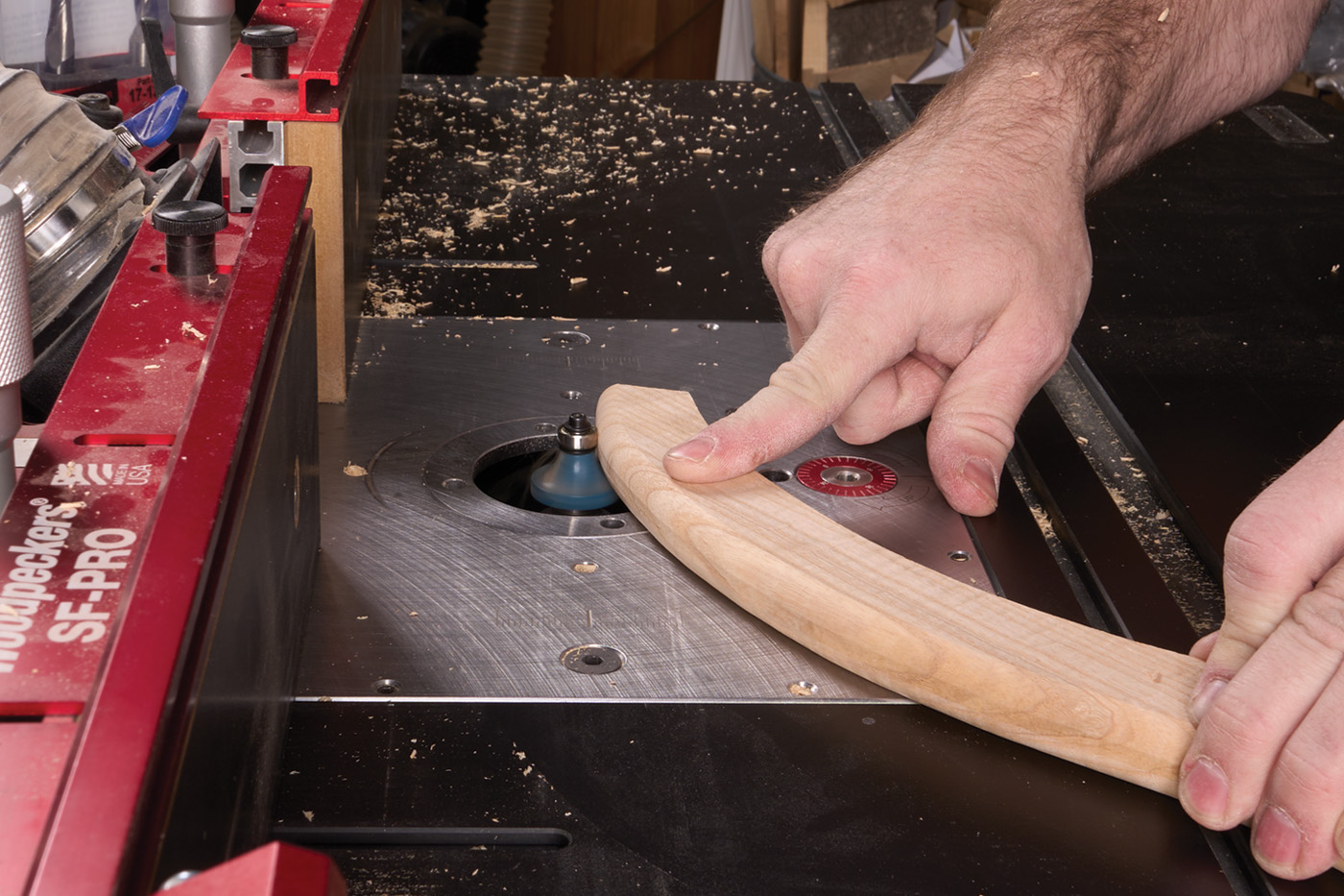 20 The legs are routed using the same dovetail bit, buried in an auxiliary fence. Check the fit until it slips in with firm pressure.