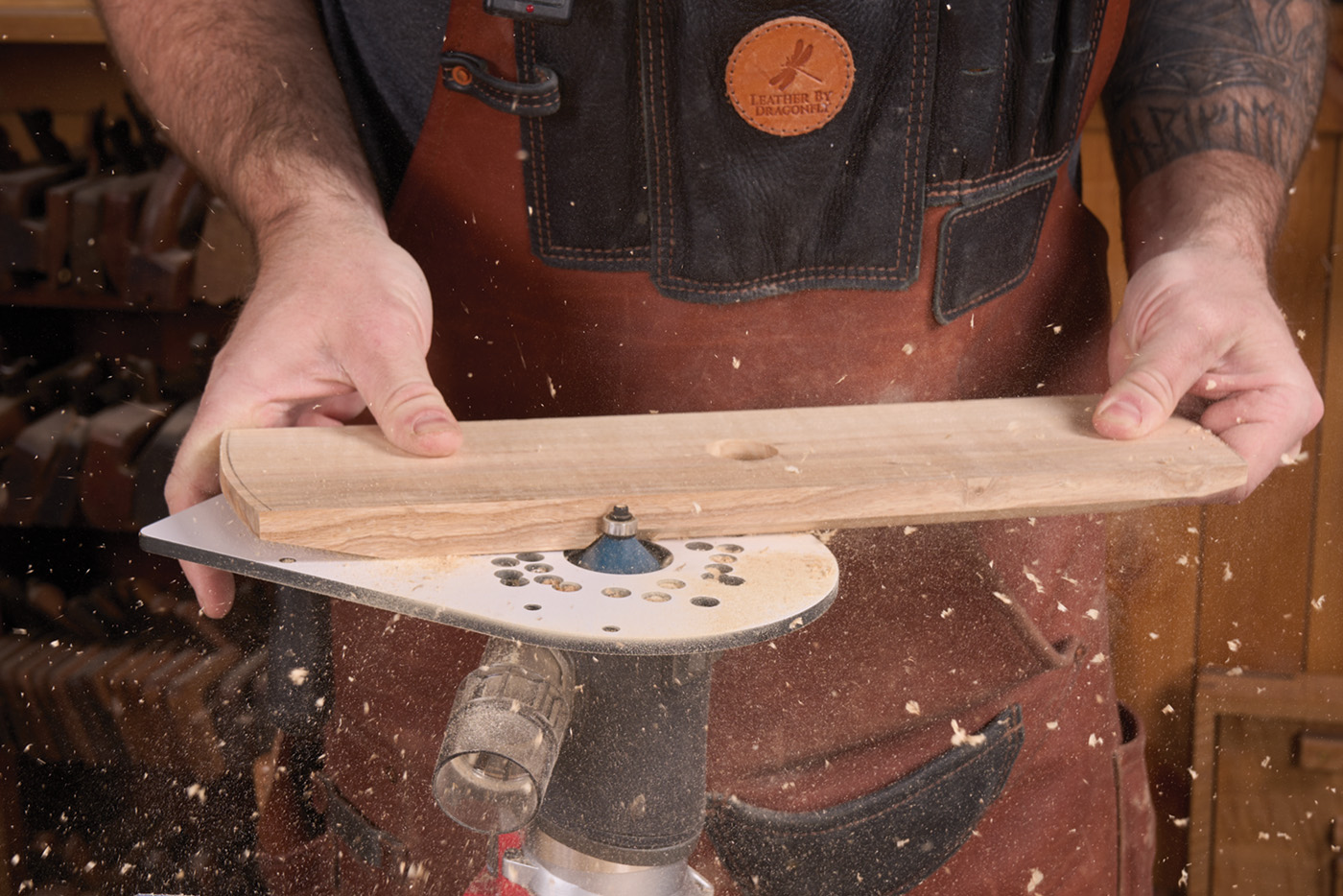 33 A scrap block taped onto the top is a pivot point for the router trammel.