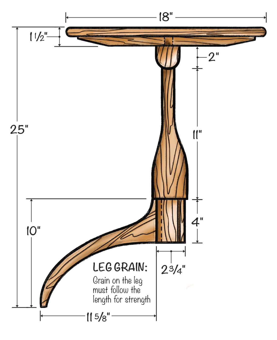 Now, let’s switch into top mode. The top needs to be 18“– diameter. I glued mine together from several boards, using the slip-match method. This gives a clean, uniform appearance, even though it is glued together. While the top was drying, I switched over to the brace. This brace is drilled with a center hole to match the tenon. The ends are slightly rounded (to match the shape of the top). They also have a long bevel on the ends. These details cause the brace to blend into the table and pretty much disappear.