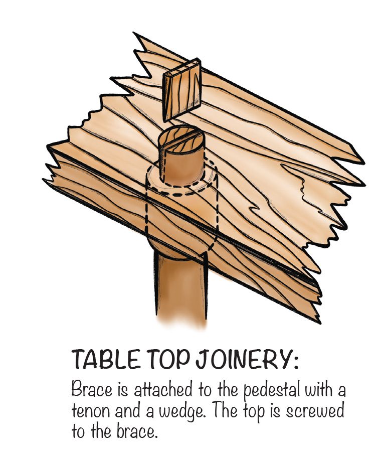 Both the bevel and the rounded ends are cut at the band saw. I free-hand cut the bevels, simply striking a line and cutting close. Likewise, I rounded over the ends in a similar fashion. At the bench, I used a plane to smooth out the bevel and the rounded ends. The long edges of the brace get a heavy chamfer with a router. Once the brace is sanded and a finish is applied, it can be attached to the pedestal. Glue the outside of the tenon, and then glue a wedge in place. Smack the wedge firmly with a hammer until it bottoms out. The remaining tenon and wedge can be trimmed flush with a pull saw.