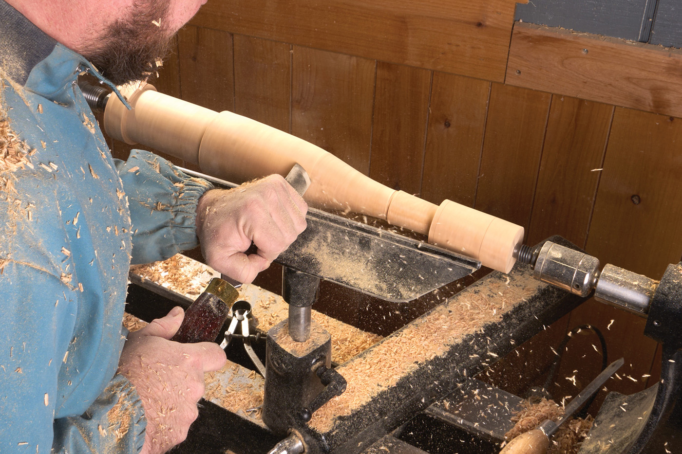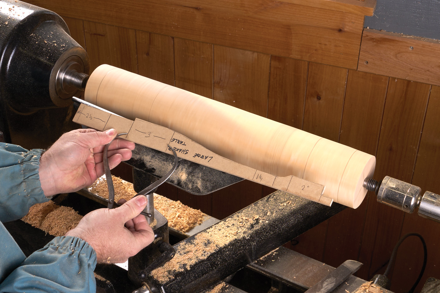 The pedestal is turned at the lathe. After roughing the blank round, I used a template that I had made to lay out points along the length. You can see my template in Photo 1. After laying out the marks, I use a parting tool and calipers to define critical diameters (photo 2). The parting tool kerfs act as a guide to help you create the correct shape while turning. I swap out the parting tool for a skew chisel and start working down to the parting marks.