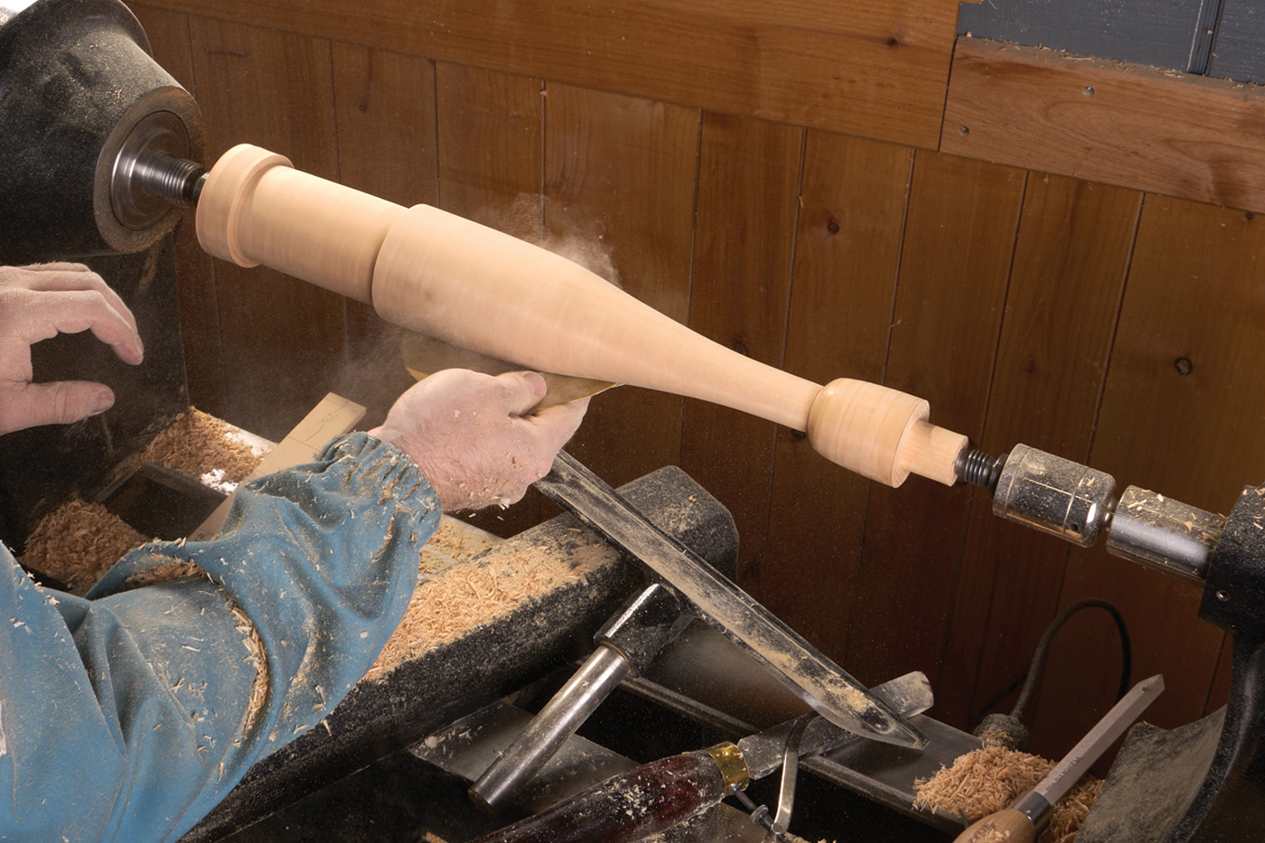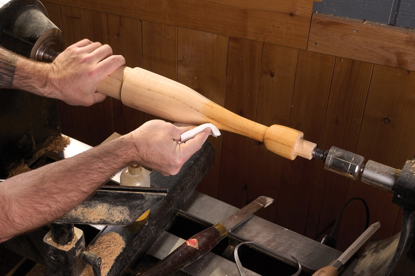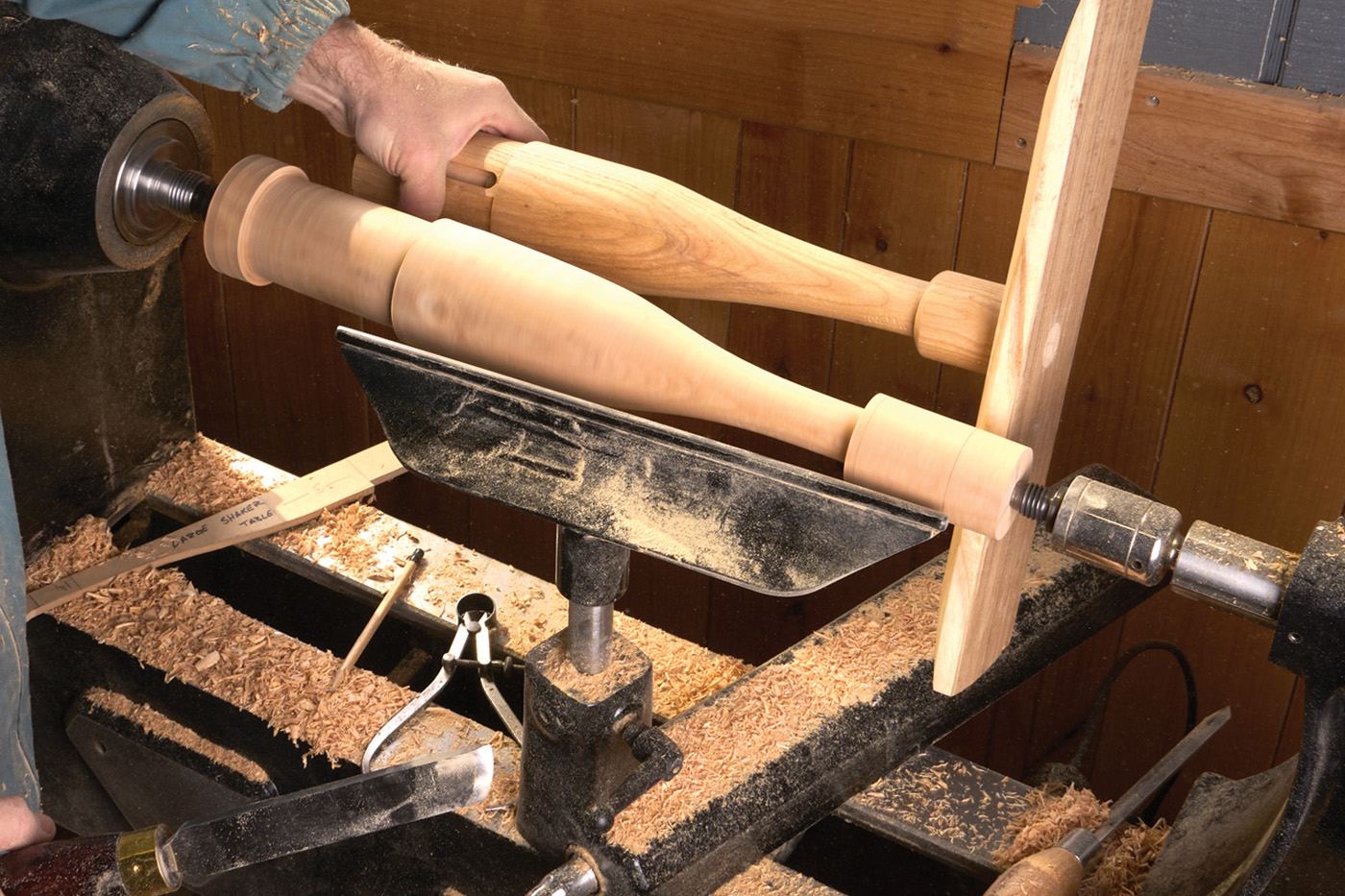 10 Sand and finish the leg while it’s on the lathe.