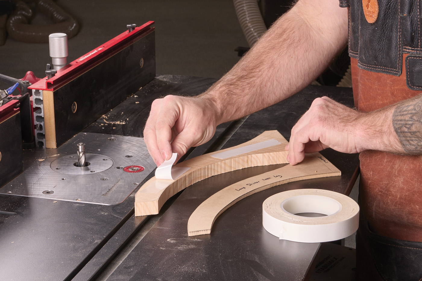 Once again, the leg pattern is made from MDF, and is the easiest way to make a set of legs that match. Use double-sided tape to hold the template to the cut legs. Now, at the router table, you’ll want to rout away the waste. Use a sharp bit (I like the spiral pattern bits from Woodpeckers) and pay attention to the grain direction. If you left just a sliver of waste, I found you can rout against the grain without a whole lot of problems. If your band sawing is not up to snuff, make sure to flip the blank around and always rout downhill. This will avoid any major tear-out.