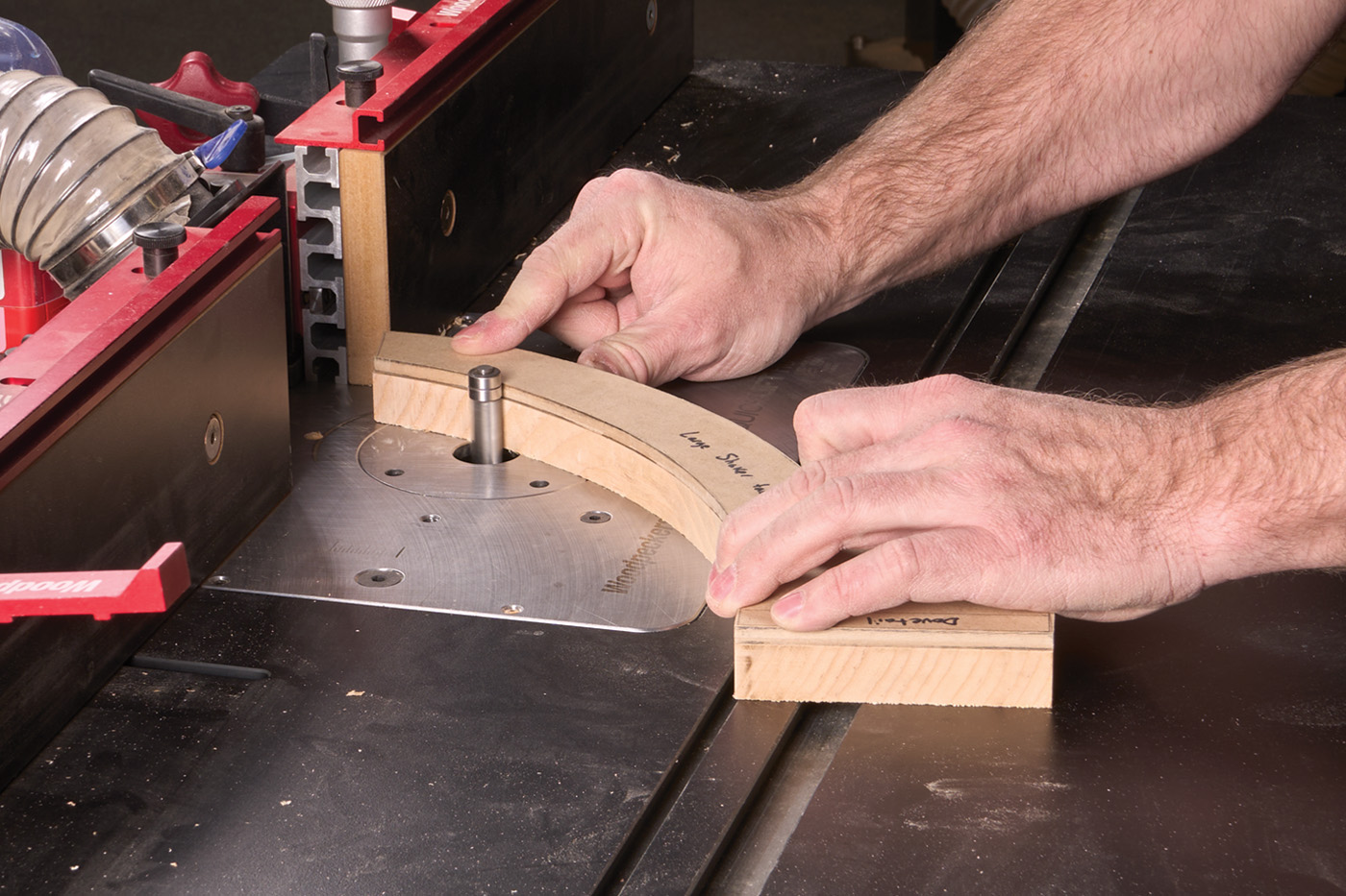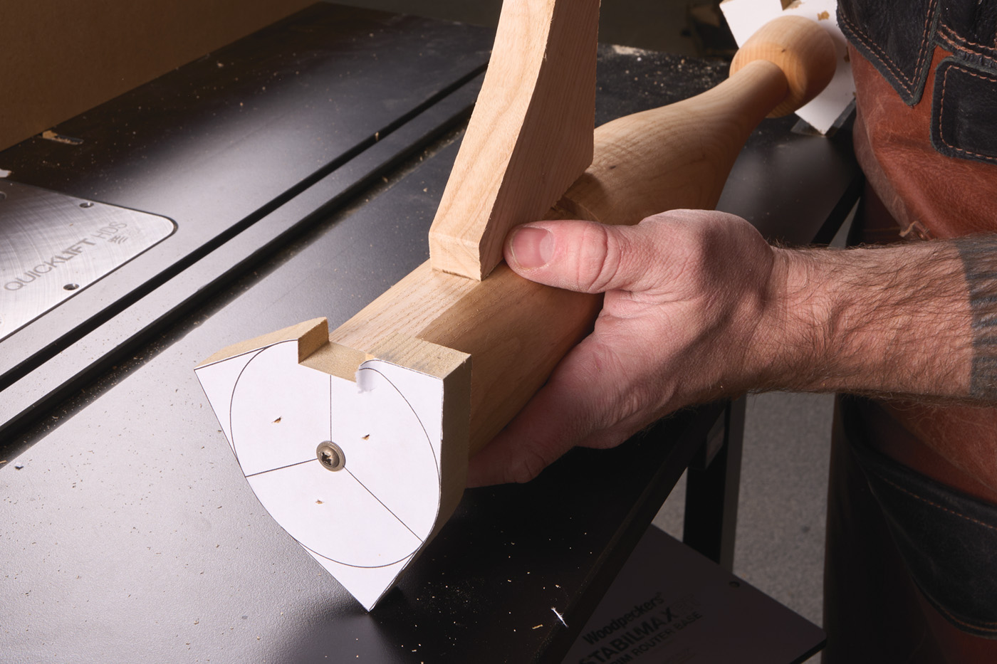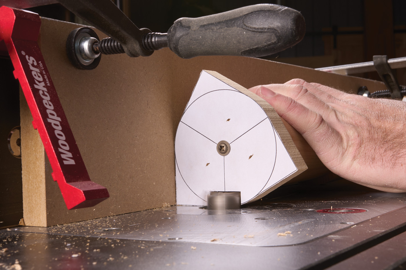 33 A scrap block taped onto the top is a pivot point for the router trammel.