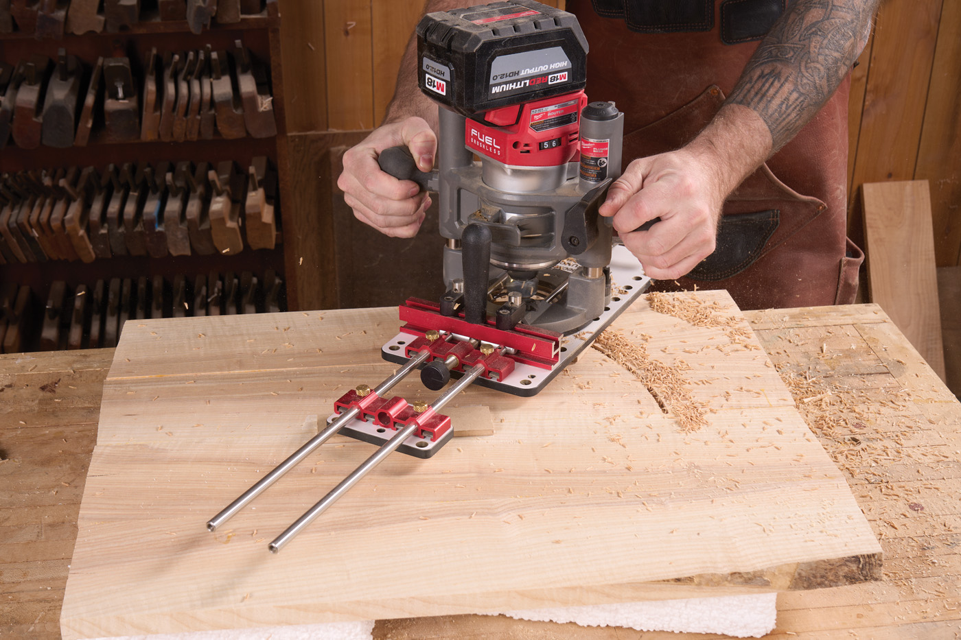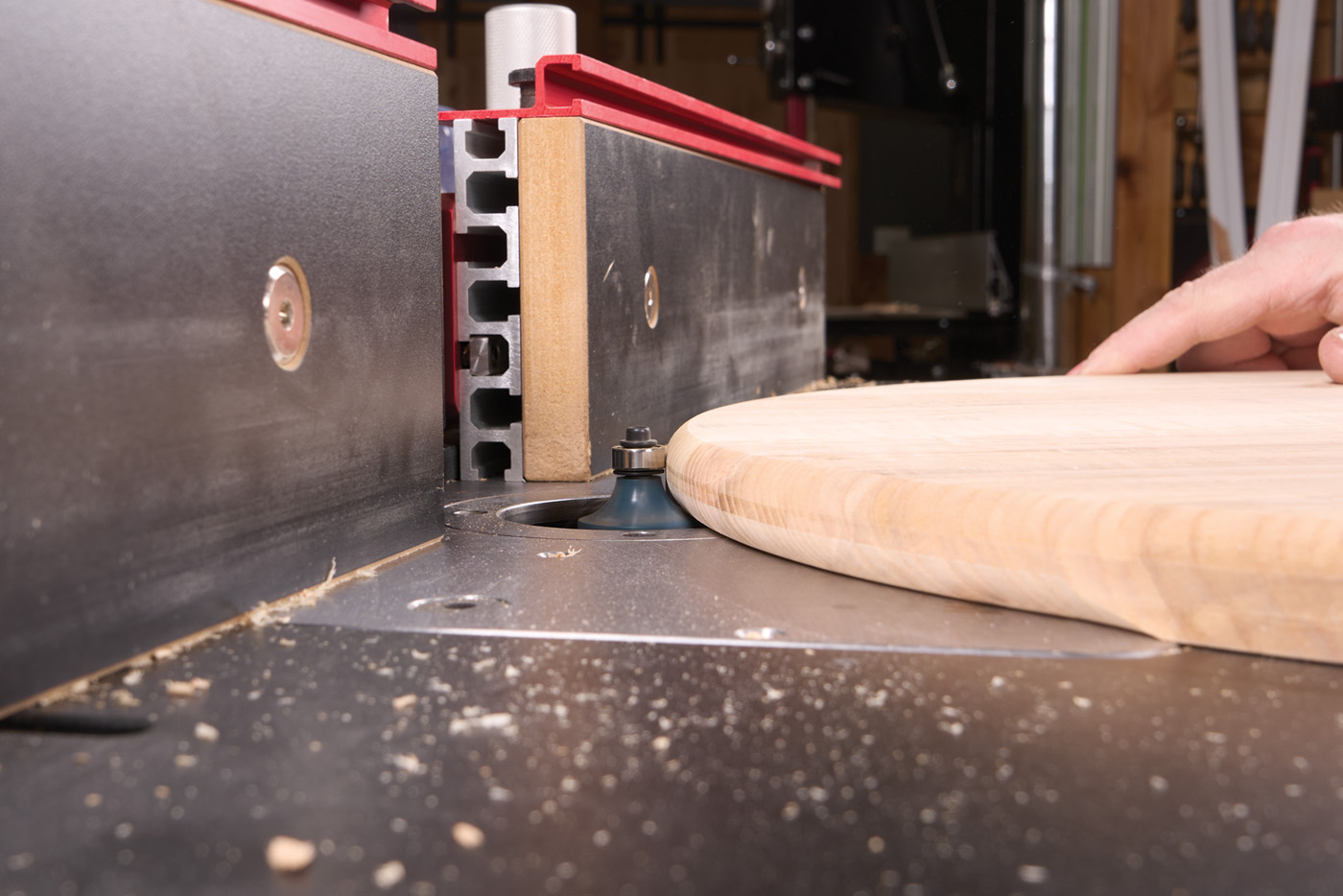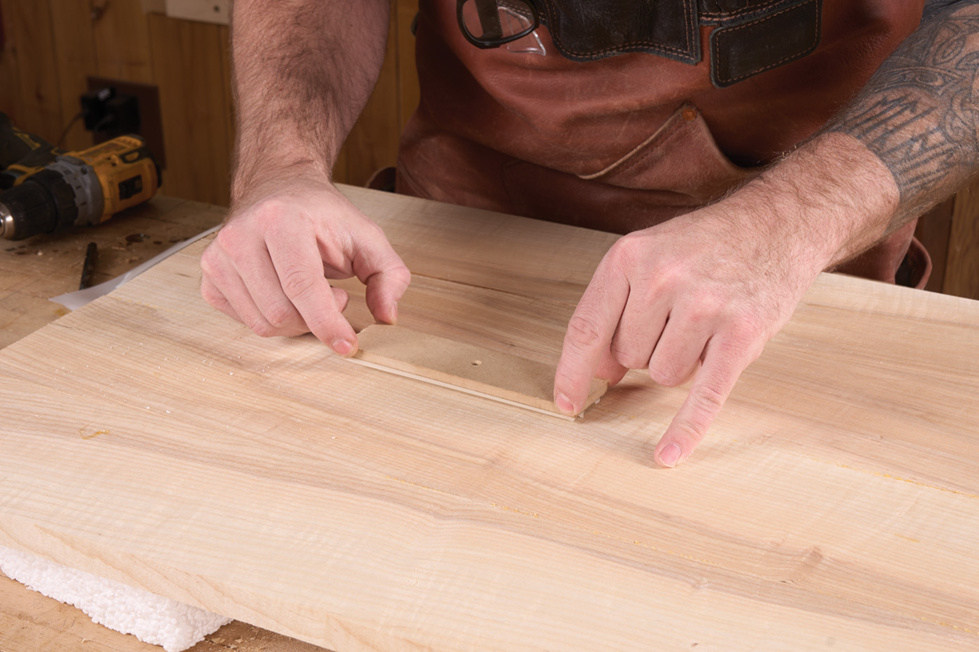 33 A scrap block taped onto the top is a pivot point for the router trammel.