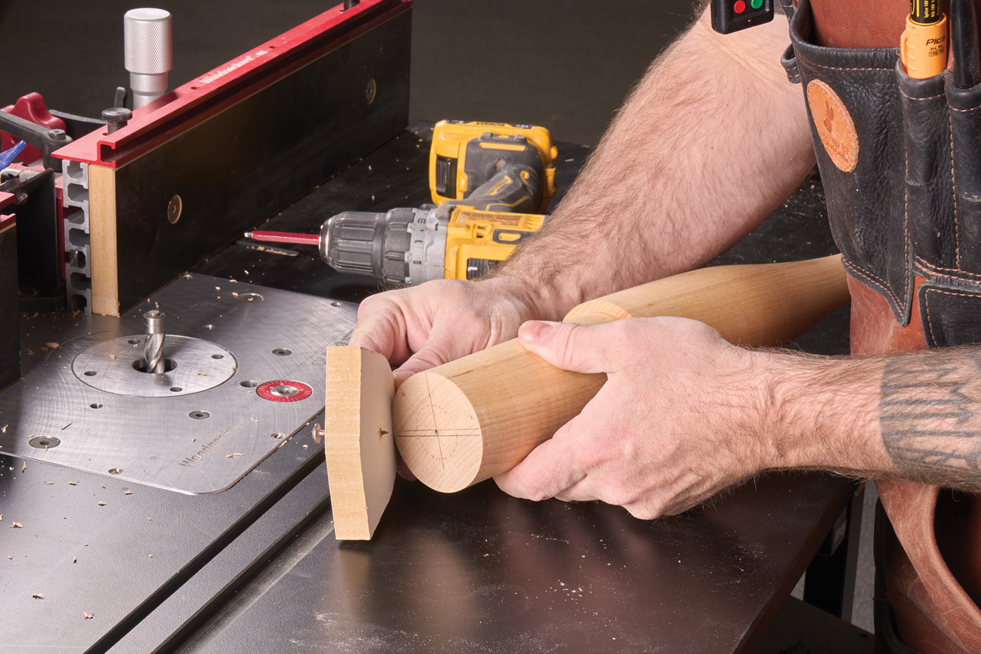 Cutting the matching dovetail on the legs is fairly straightforward. Leave the dovetail bit in the router table, and lower it to match the depth of the slot. Make a few test cuts on a piece of scrap the same thickness as your leg. You can make the dovetail wider or narrower by adjusting the fence. Pay attention to the depth of the dovetail as well, and adjust the bit height as necessary for a good, snug fit.