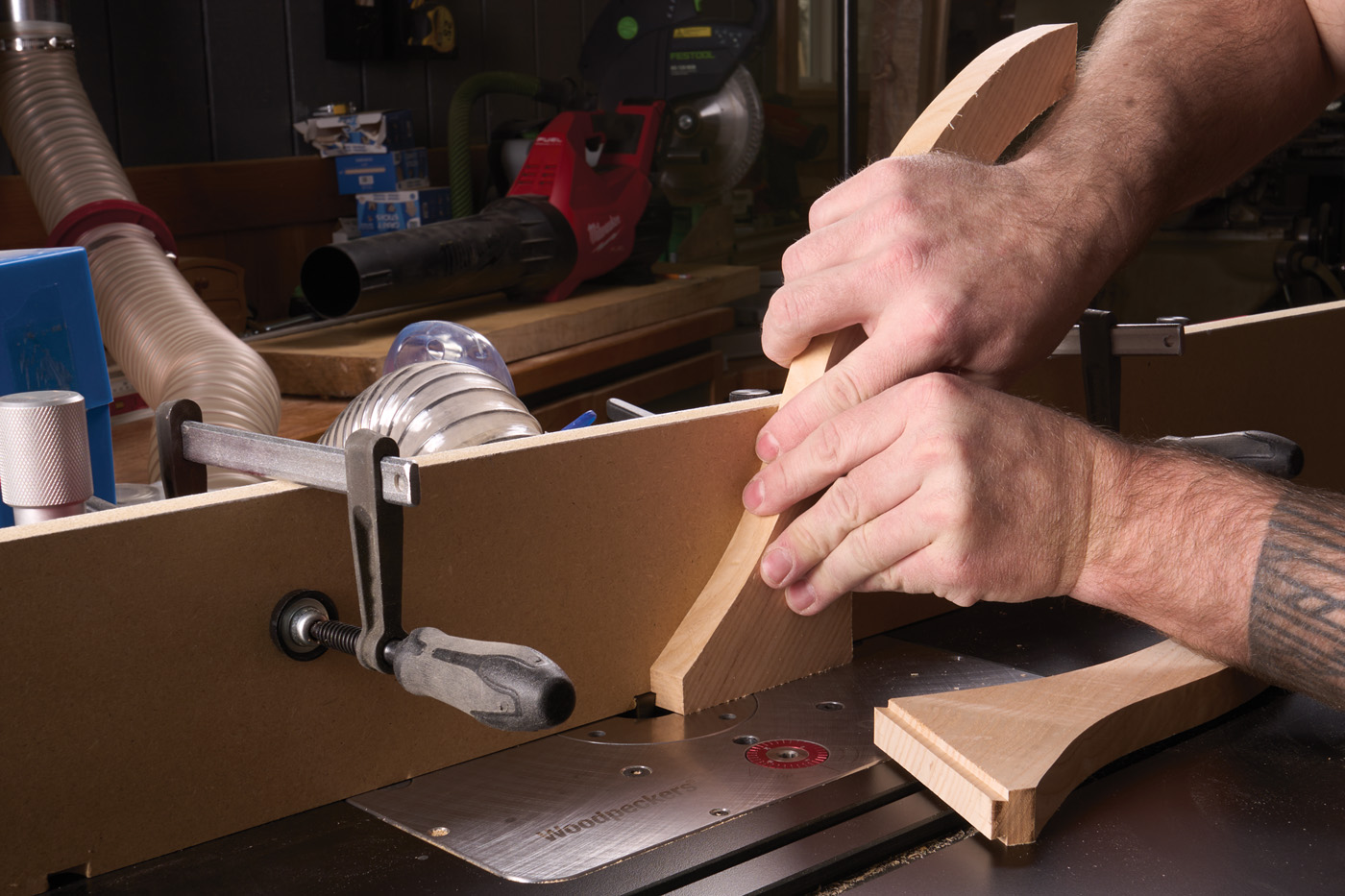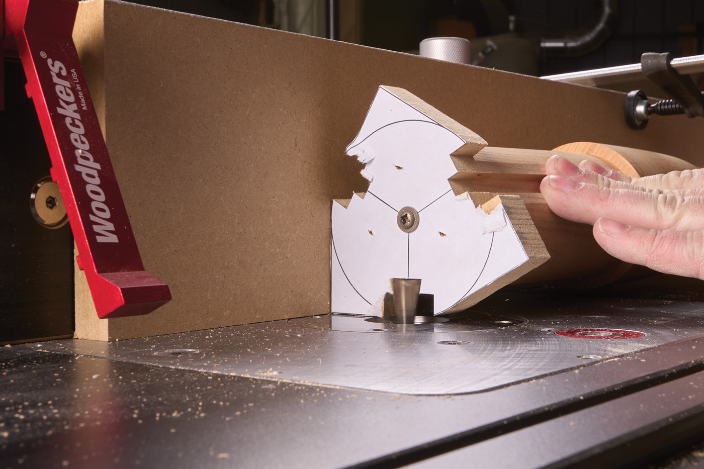 20 The legs are routed using the same dovetail bit, buried in an auxiliary fence. Check the fit until it slips in with firm pressure.
