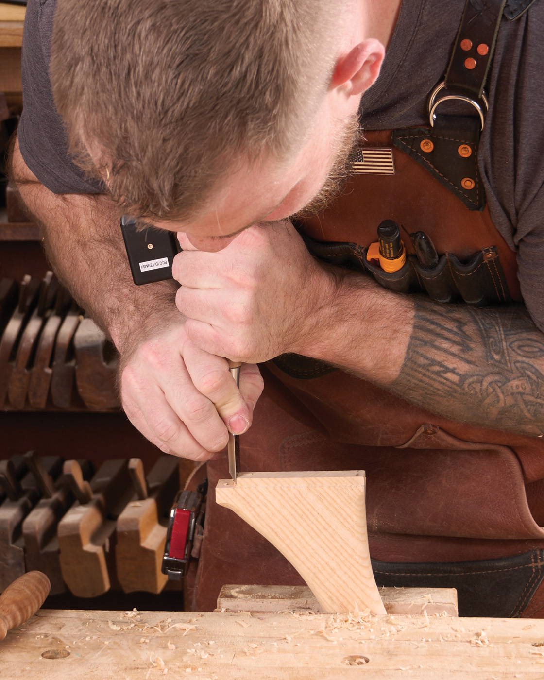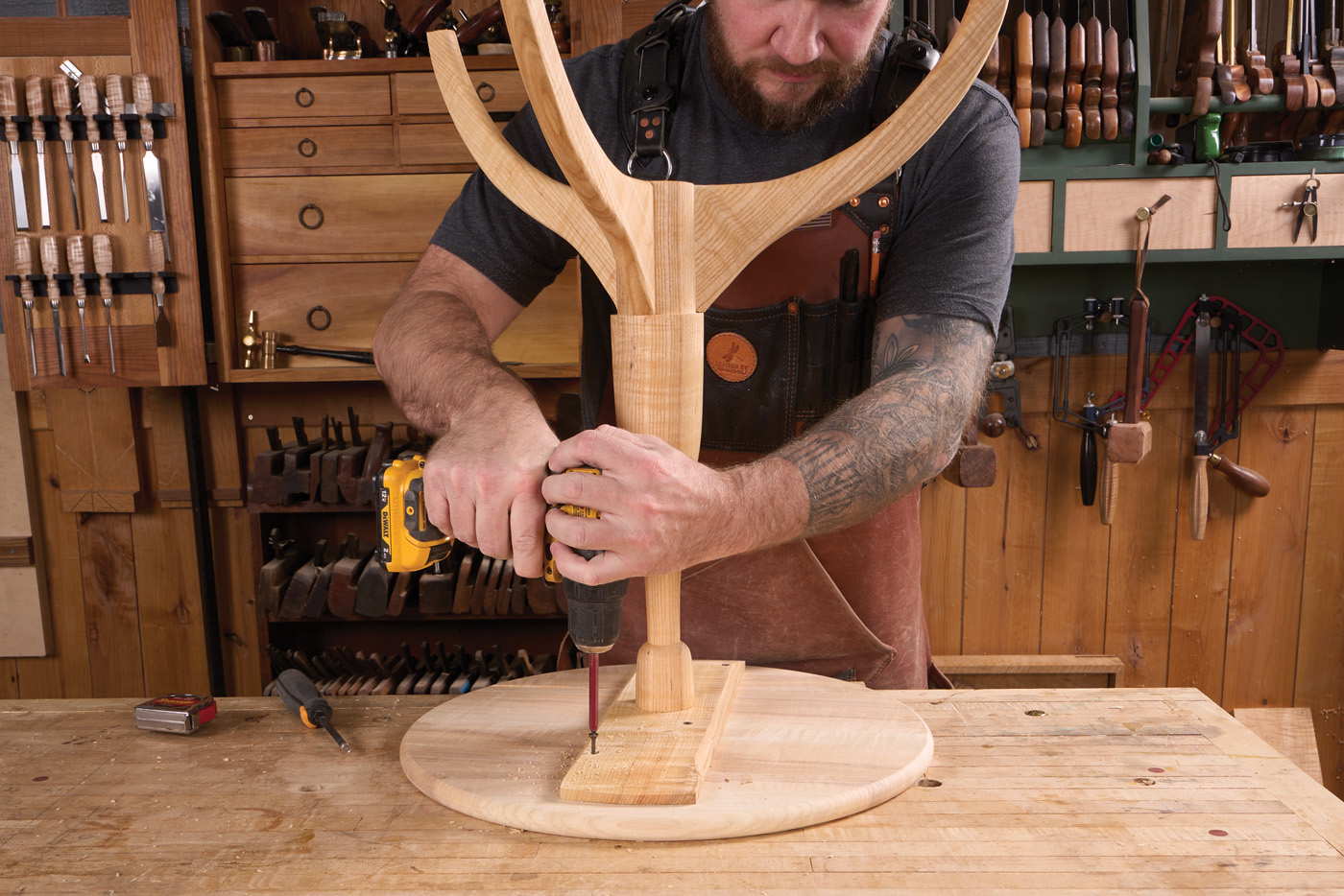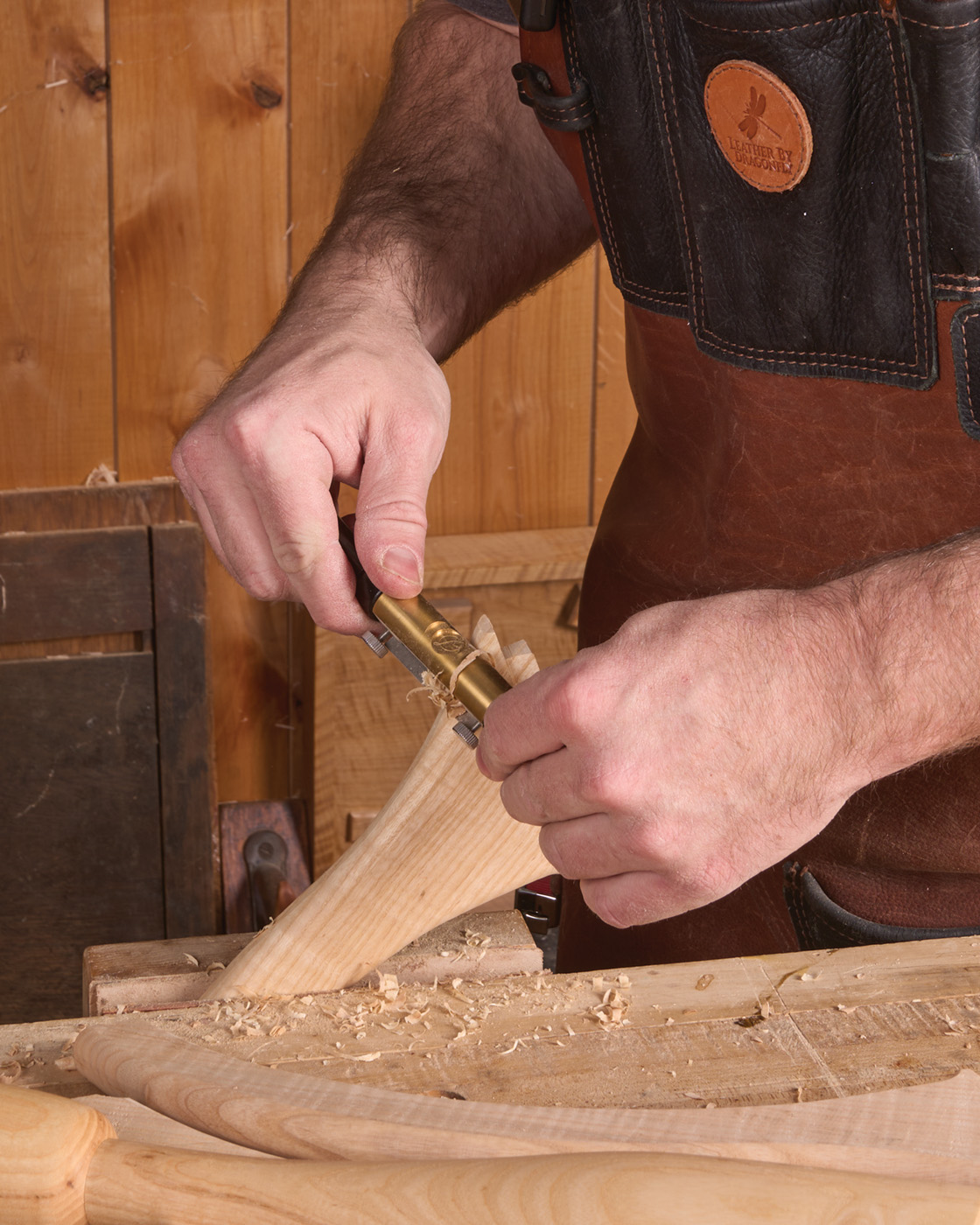 23 A spokeshave helps blend curve of the leg to the pedestal.