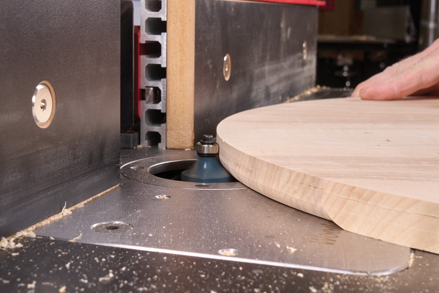 The top gets the same roundover treatment that the legs got earlier. The goal here is to create a round-over that is almost a bull-nose. Take time to dial in the height of the bit to leave a flat for the bearing to ride on as possible. Make a pass around one edge first (photo 35), and once that’s done, flip the top over and do the other side (photo 36).