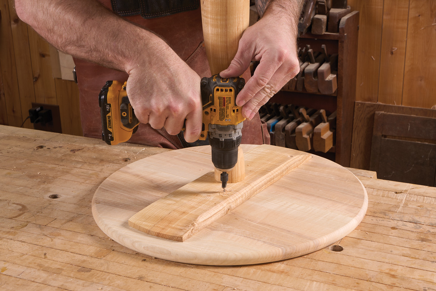 With the glue on the top panel dried, you can cut it to shape. Cutting the circular top can be done in a few ways. If you must, a jigsaw will suffice. You’ll need to clean up the edges with rasps and sandpaper, more than likely. The next best option is a band saw. If you have a circle cutting jig, this is easy. If you free-hand it, there will still be a bit of clean-up to do. I feel as though the best method to cut clean circles is with a router trammel, as you see in photo 34. I use a scrap block as a pivot point (inset photo 33) taped to the center of my panel. The trammel is located in the drilled hole in the scrap block and swings the router around the central point. Using a spiral upcut bit and making multiple passes, you’re left with a circle that is super clean and only requires a light hand sanding to clean it up. The best part of all is that using a scrap block means you don’t need to drill into your blank unnecessarily.