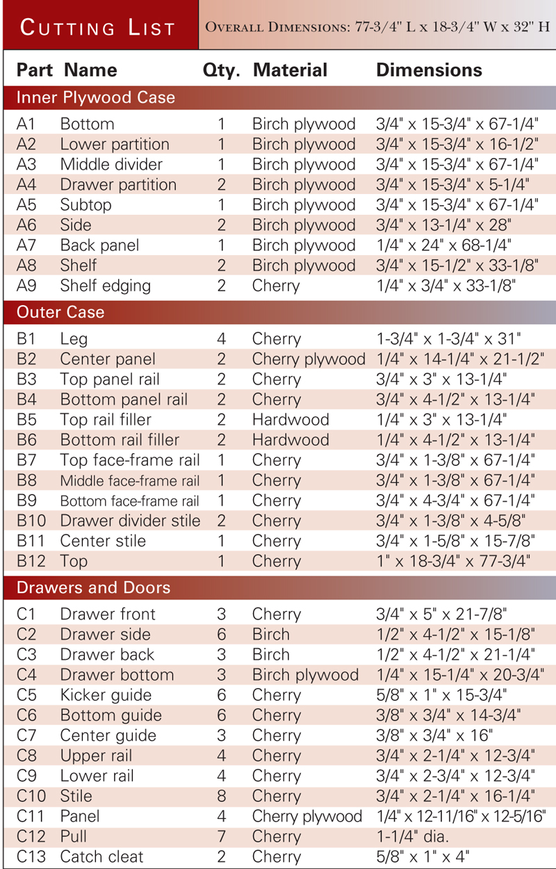 Build the plywood case1. Cut the plywood case parts (A1 through A7, Fig A, Plywood Cutting Diagram; Cutting List). 2. Assemble the bottom, lower partition, middle divider, drawer partitions and subtop with glue, screws and biscuits. 3. Attach the sides (A6) to the plywood case (A1 through A5). Use a 1-in. spacer board at the front corners to create a notch for the legs (B1) to fit into (Photo 1). A precise 1-in. setback ensures that the face frame, which later attaches to the plywood case, lines up evenly with the front face of the legs. Add the leg panels4. Make the legs (B1). Cut the tapered foot (Fig. A) on your bandsaw and use a belt sander to smooth it. Cut a stopped groove for the 1/4-in. center panel (B2) using a slot cutter on your router table (see Sources, at bottom). 5. Cut the stopped rabbet in the back of the rear legs for the back panel (A7) (Fig. A). 6. Make the top and bottom panel rails (B3, B4) and rout grooves in these parts for the center panel. 7. Assemble the leg panels (Photo 2). Use biscuits and glue to join the rails to the legs. When the glue is dry, clamp the leg panels to the plywood case. 8. Cut filler boards (B5, B6) and test their fit (Photo 3). You’ll need to adjust the thickness of these fillers if the plywood you used for the plywood case sides (A6) is not exactly 3/4 in. thick (3/4-in. plywood commonly runs undersize). 9. Unclamp the leg panels and glue the filler boards to the inside surface of the rails. When the glue is dry, attach the leg panels to the plywood case with screws only (Photo 4). Note: Do not use glue at this time. Notice that the screws run through the plywood sides in the drawer opening and below the case’s bottom. These screws are hidden when the sideboard is complete. Make the face frame10. Cut out the face-frame parts (B7 through B11). Test-fit the face-frame rails between the front legs on the cabinet to make sure they are the correct length. 11. Assemble the face frame with dowels (Photo 5). 12. Attach the face frame to the plywood case (Photo 6). Use biscuits to align the face frame to the plywood case. Note: At this time, do not put glue on the end of the rails where they meet the legs. 13. After the face frame is attached to the case and the glue has dried, unscrew and remove the leg panels. 14. Cut biscuit slots in the ends of the rails. The middle and top rails are too narrow for a full biscuit. Position your biscuit joiner on the ends of these rails so the slot breaks out at the top of the rail, but not on the bottom. This will produce a slot for a half-length biscuit. The bottom rail is too narrow for two full biscuits. Position the biscuit slots in the ends of this rail close together so they don’t break out at either the top or bottom. Cut the biscuits for these slots to about three-quarters of their length. Cut corresponding biscuit slots in the front legs. 15. Apply glue to the filler boards’ inside surfaces, the ends of the face-frame rails and the biscuit slots on the legs. Reattach the leg panels to the plywood case (Photo 7). Complete the case16. Glue up the top (B12) and attach it to the plywood case with screws. The holes in the plywood subtop (A5) should be drilled oversize to allow seasonal movement of the top because it’s solid wood. 17. Attach the back panel (A7). 18. Cut the shelves (A8) and glue on their edging (A9). 19. Drill for shelf pins (see Sources, below). Add the drawers20. Make drawer boxes with lipped fronts (Fig. A, Detail 1). I used a half-blind dovetail jig with a 1/2-in.-dia. 14-degree dovetail bit. My jig produces dovetails on 7/8-in. centers, so I ended up with good-looking half pins on both the top and bottom of the drawer sides. 21. Groove the drawer sides, back and front for the drawer bottoms (C1 through C4). Round the front edges using a 1/4-in. round-over bit in your router table. Then assemble the drawers. 22. Attach kicker guides (C5) to the inside of the drawer openings. Adjust the thickness of these guides so there is 1/8-in. clearance between them and the top of the drawer sides. 23. Cut a notch in the bottom edge of the drawer back for the center guide (C7). Attach the bottom guides (C6) to the drawer boxes (Photo 8). Use a spacer between the guides to assist with positioning, but slide the spacer out before the glue sets to prevent it from sticking to any glue that squeezes out. 24. Attach the center guide to the inside of the drawer opening with screws at the front and back. Test the fit of the drawer box. There should be about 1/8-in. clearance along the sides of the drawers. Build the doors25. Cut out the parts for the doors (C8 through C11). Use a slot-and-tenon cutter to machine the joints (see Sources). Assemble the doors. 26. Round the outer front edge of the doors to match the drawer fronts’ roundovers. 27. Rabbet the top and bottom back edges of the doors (Fig. A, Detail 2). 28. Rout and chisel mortises for the butt hinges in the doors and front legs (see Sources) and hang the doors. (Self-closing European-style hinges can be substituted for the butt hinges; see Sources.) 29. Drill the doors and drawers for the wood pulls (C12) and install them (see Sources). 30. Glue the door catches’ cleats (C13) to the back of the center rail and attach the magnetic catches. 31. Remove the doors, drawers, cabinet back, and hardware and finish-sand all the parts. Apply the finishI used the following products and procedure to achieve the rich, even, cherry tone that you see on the finished sideboard. It looks close to unstained cherry after it ages but somewhat redder. If you prefer the browner tone of naturally aged cherry, skip Steps 33 through 36. 32. Brush on a coat of SealCoat dewaxed shellac (see Sources, at bottom) and let it dry overnight. 33. Sand lightly with 220-grit paper. 34. Brush on a second coat of SealCoat and let it dry overnight. 35. Sand lightly with 220-grit paper. 36. Apply a coat of General Finishes Candlelite gel stain (see Sources). Let it dry ove
