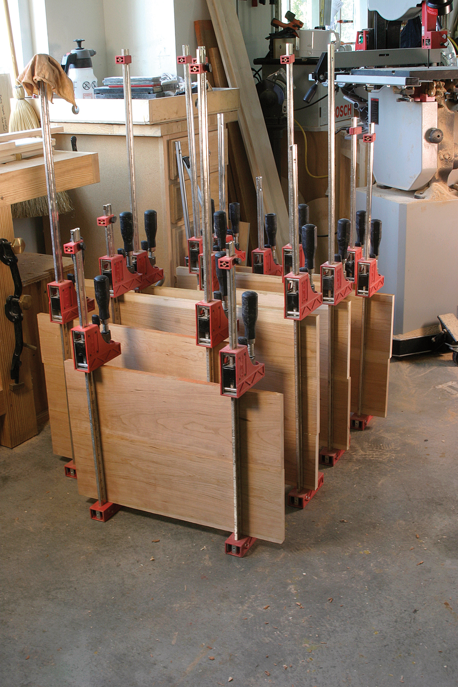Dry-fit all your panels to the grooves inside the door frames and the bottom case sides, and make any necessary adjustments. Once everything fits snug, get your clamps ready and work with one glue-up at a time (I started with the lower doors and side panels, as they involved fewer pieces).