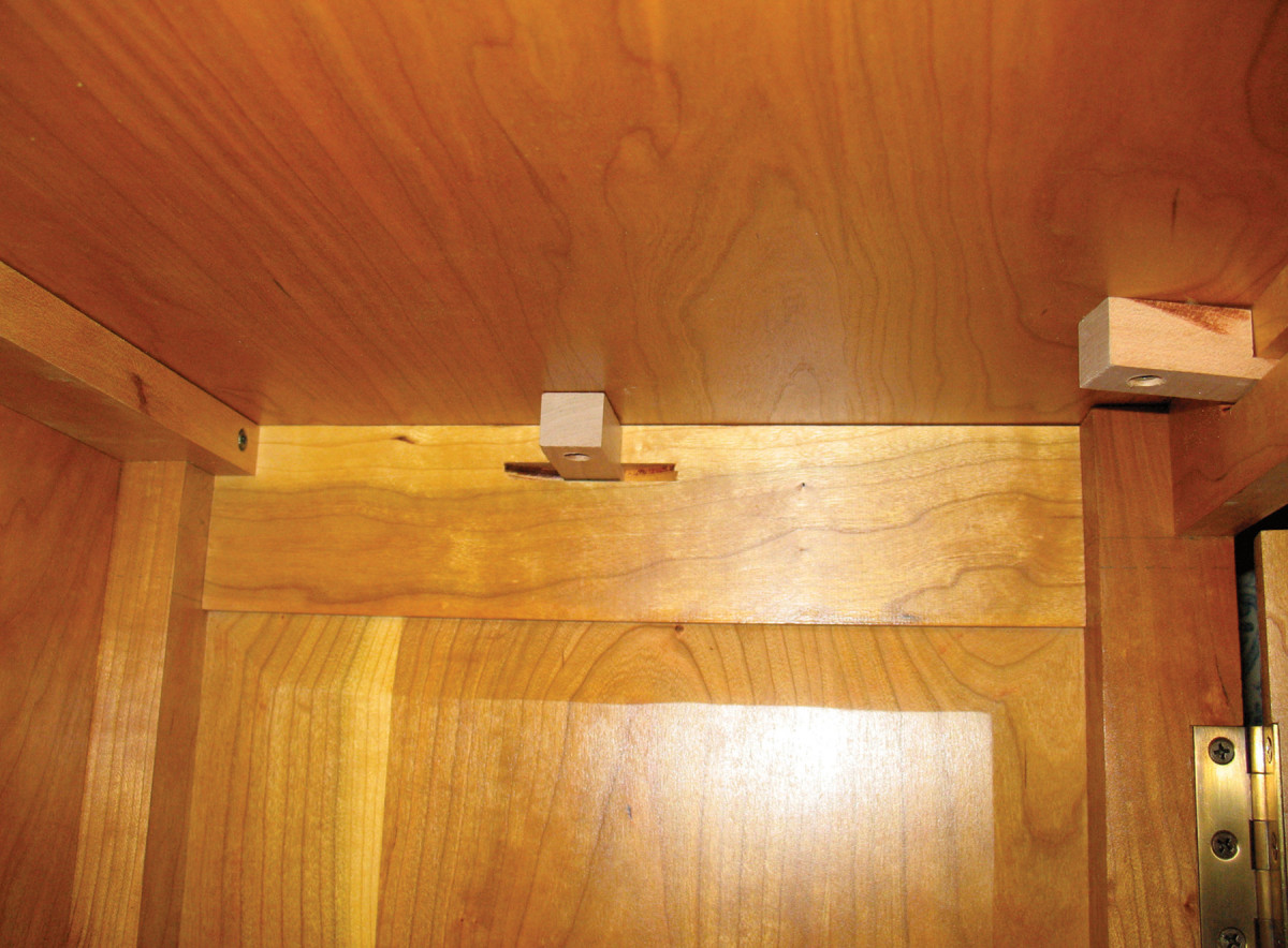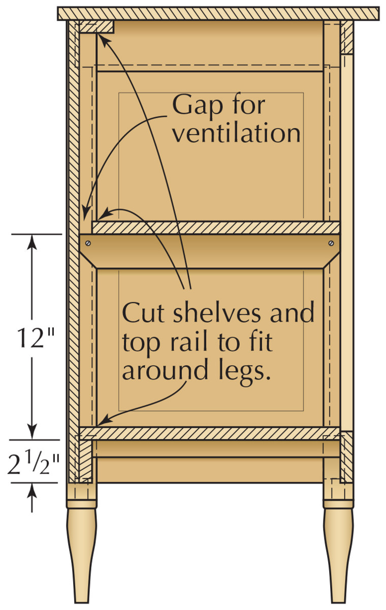 With the backboards and doors off, now’s the time to fit the cleats that support the bottom and shelf in the lower section, and cut button slots in the top rail to attach the top. The bottom is notched around the legs and the back edge is rabbeted to fit neatly over the back rail. But because I need airflow in the bottom section for A/V equipment, I fit the shelf to the inside corner of each leg and to the front center stile where it serves as a door stop. I left a gap at the back and sides to run wires and for air circulation.